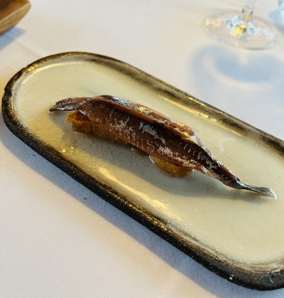 Un entrante que me encanta por su potencia y a la vez aparentemente sencilla elaboración, es la Anchoa sobada a mano, pan cristal, tomate y mantequilla.