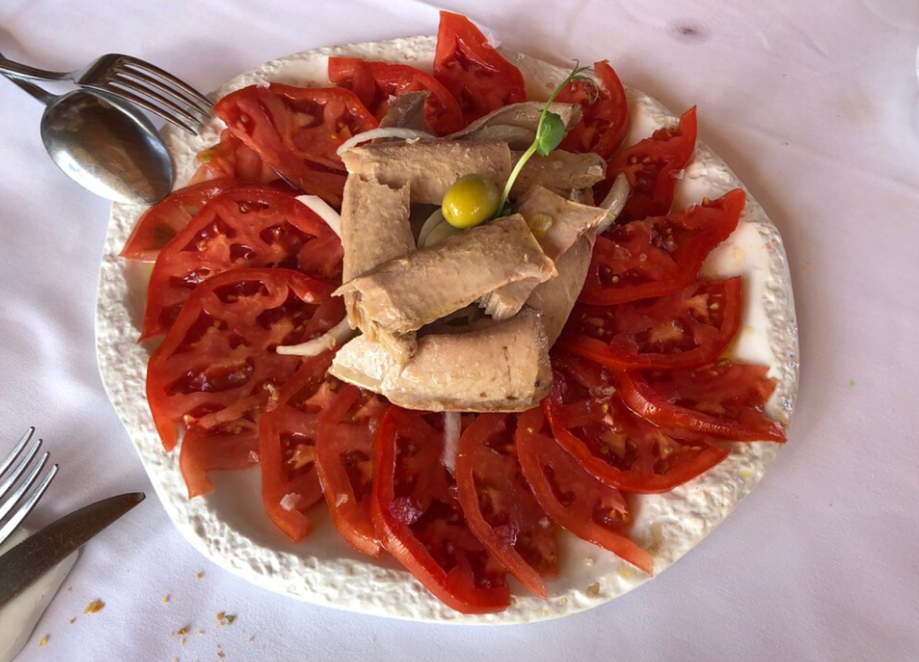 Su cocina está basada en productos de cercanía, a los que le sacan un provecho excepcional. Productos de temporada, donde podrás ver una ensalada de tomate con ventresca de bonito, anchoas, gambas, colas de cigala, etc.