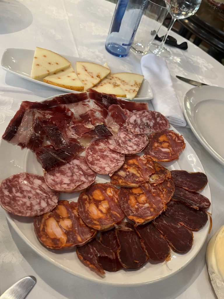 Comida basada en productos de primera, sencillos y muy bien tratados. Aquí tenemos una ración de ibéricos, cortados como debe ser. Hay lugares que los sirven como papel de fumar, pero aquí da gusto comer esa ración de ibéricos y queso.