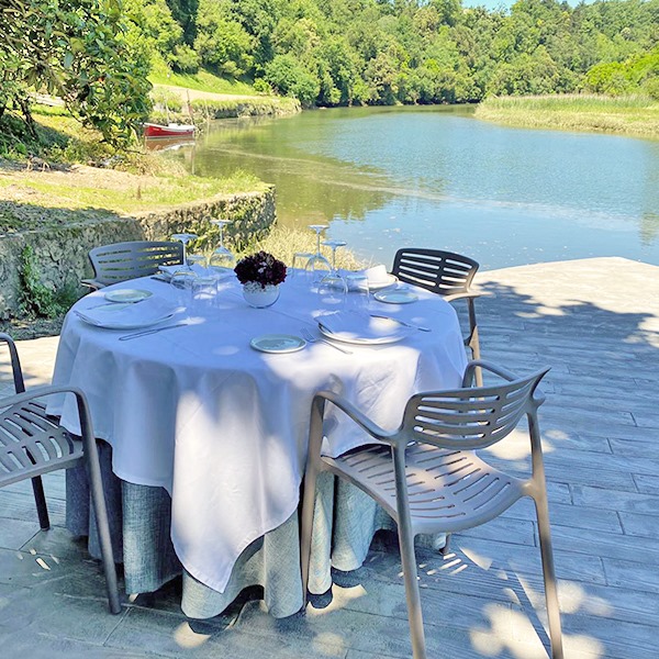 El Bedua cuenta con una terraza climatizada para unos 100 comensales, desde donde puedes disfrutar de la comida a pie del río Urola con vistas a la huerta bajo la sombra de unos arboles.