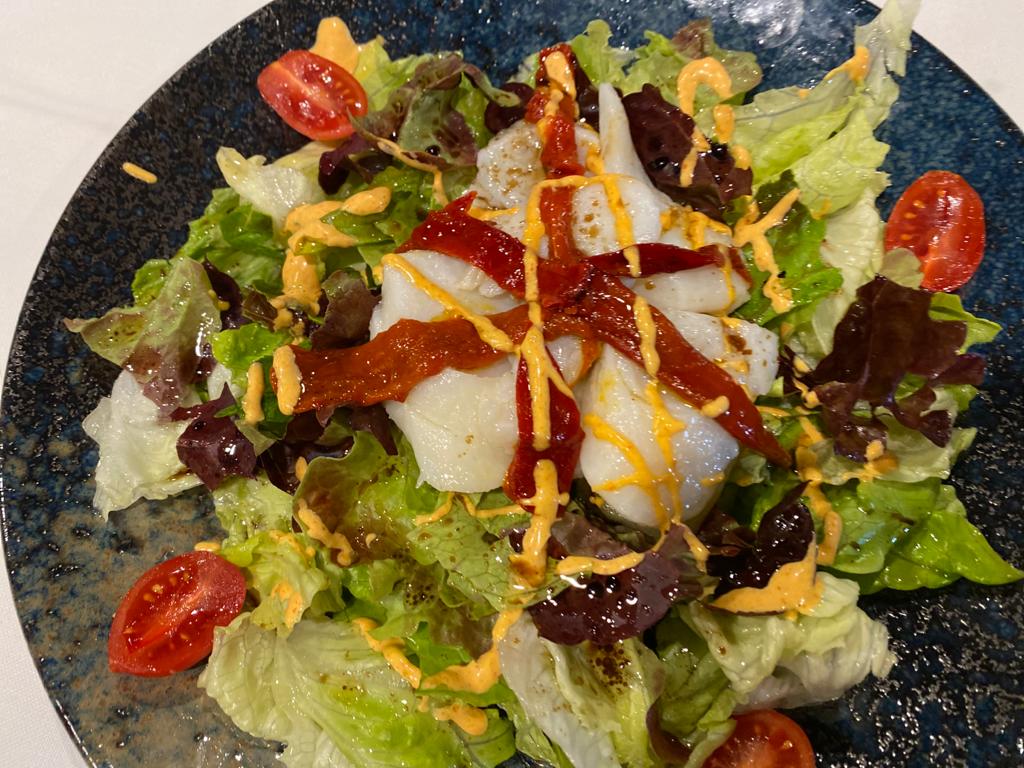 Una vez que os he hablado del restaurante y su entorno, hablemos de su comida. Está considerado como uno de los mejores asadores de Euskadi, y sin embargo voy a empezar por otros platos, que no dependen de la brasa, como su ansiada tortilla de patatas, todo el que pasa por allí la prueba. O sus croquetas, por supuesto las distintas ensaladas, su verdura de temporada o esas colas de cigala rebozadas que son un verdadero placer para el paladar.