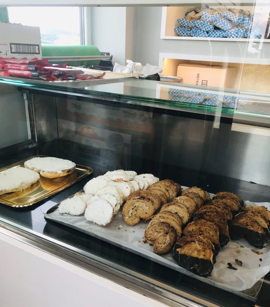 A mano izquierda tenemos el mostrador donde venden pan, pasteles, etc. Aunque ahora lo tienen un poco aparcado y ofrecen una extensa gama de vinos blancos.