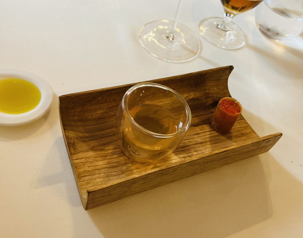 Como os decía, aquí los productos son de temporada y km 0, con lo que la carta o los diferentes menús, los modifican casi de forma semanal. Nosotros comenzamos con una sopa de manzana dulce y crujiente de salmón con mayonesa de salmón y sus huevas.