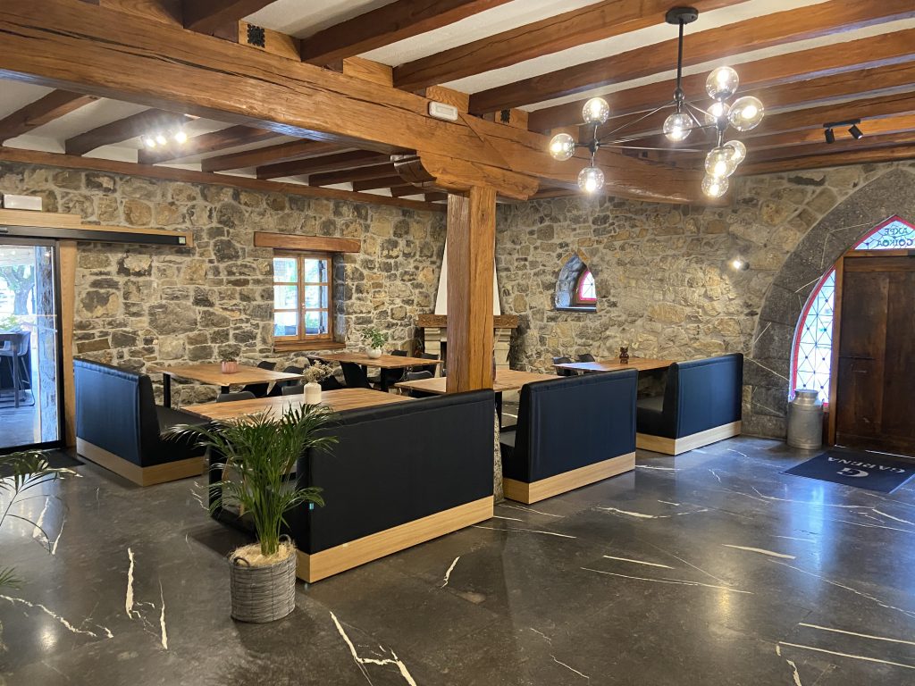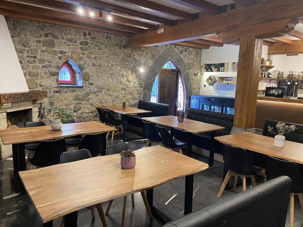Al restaurante entramos por el bar y terraza, donde los fines de semana y festivos, puedes disfrutar de raciones y platos más informales, pero hechos manteniendo la esencia de cocina creativa vasca. Tiene 2 comedores, el comedor principal en la 1ª planta y otro en el piso superior.