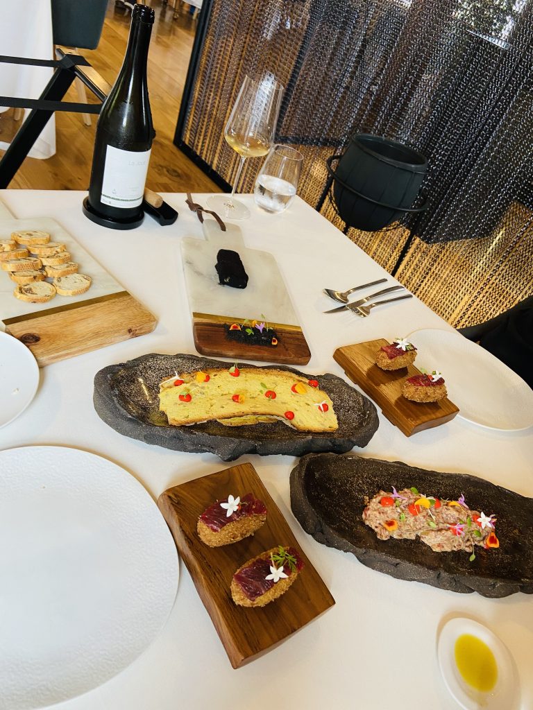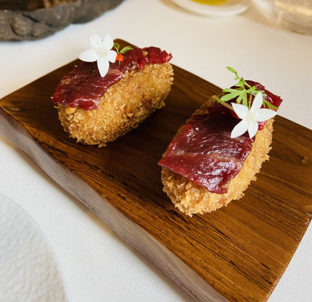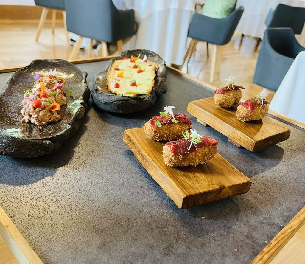 Nosotros, quisimos probar un poco de todo, aquí podéis ver el foie-carbón, acompañado de unas tradicionales croquetas de jamón, y un steak tartar de Betizu.