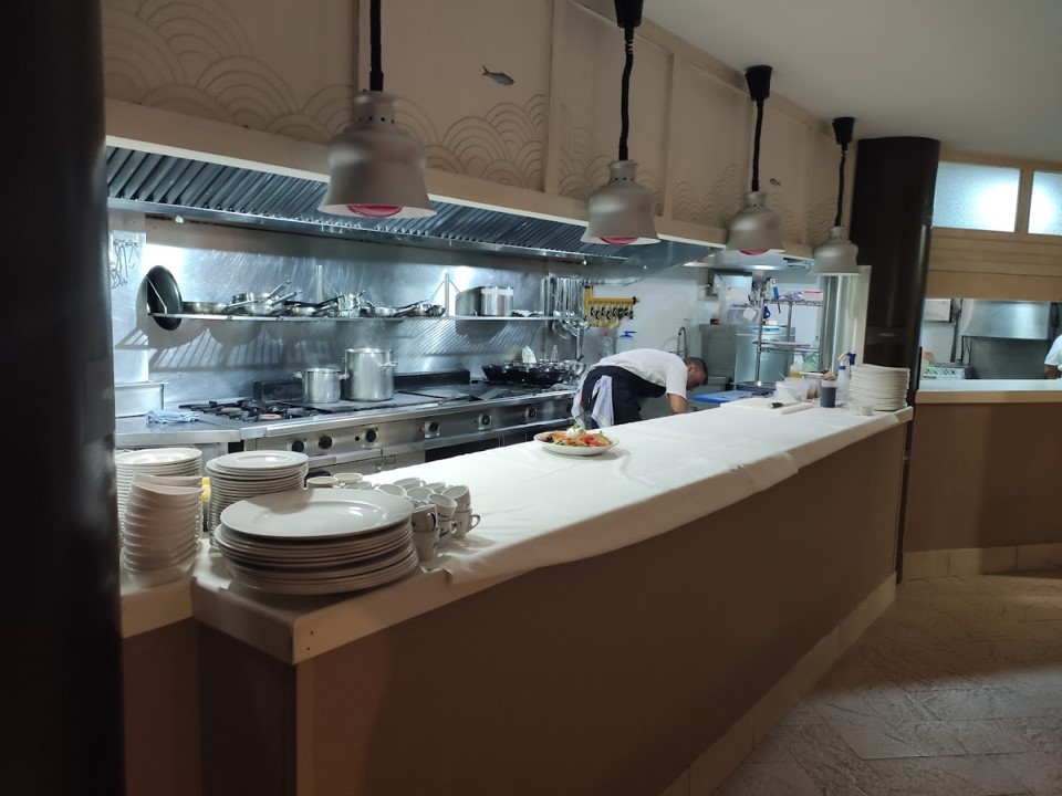 Ya dentro del restaurante, te reciben en un hall, donde vemos una barra de bar a la izquierda y a la derecha podemos ver la cocina vista que tienen, donde puedes ver a los cocineros en plena faena.