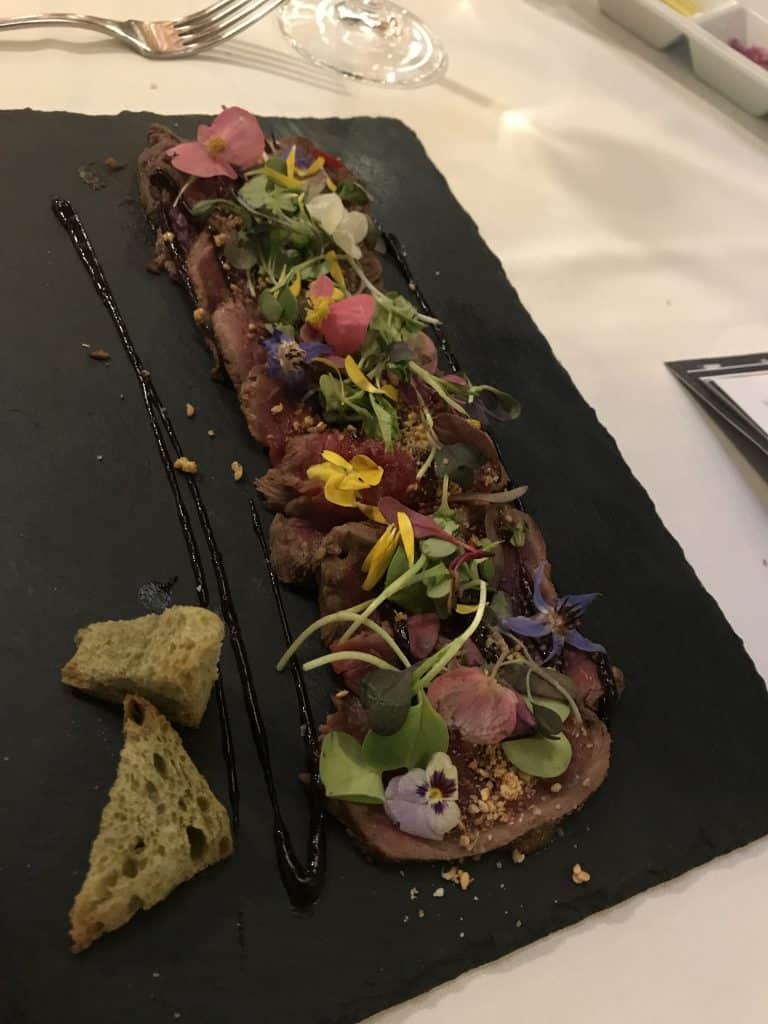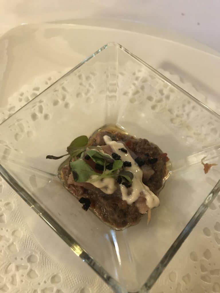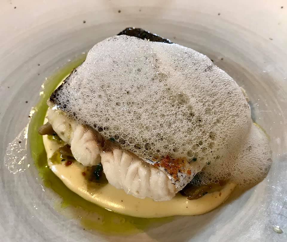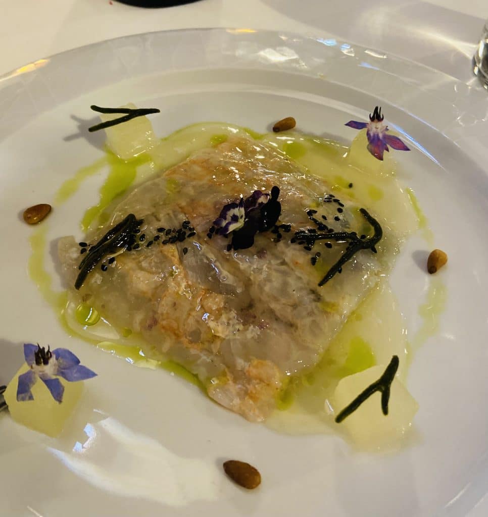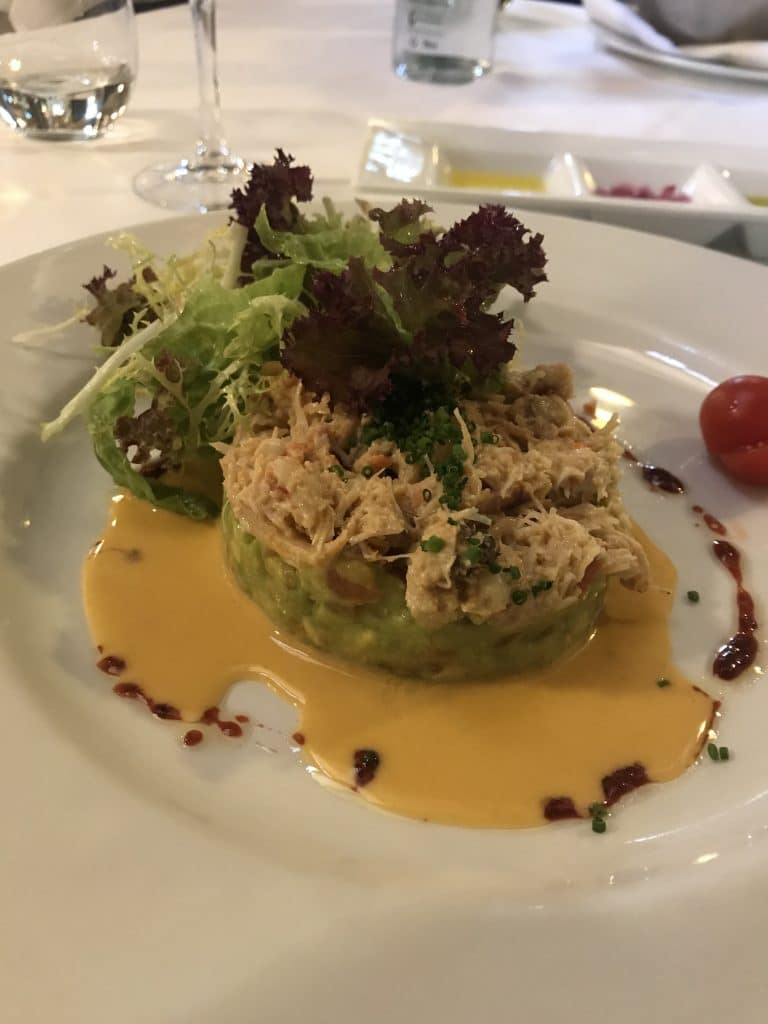 Aquí tenemos un ejemplo de platos divertidos, frescos y muy buenos. Una ensalada de txangurro y aguacate, y un carpaccio de cigala con panceta de cerdo, realmente rico.