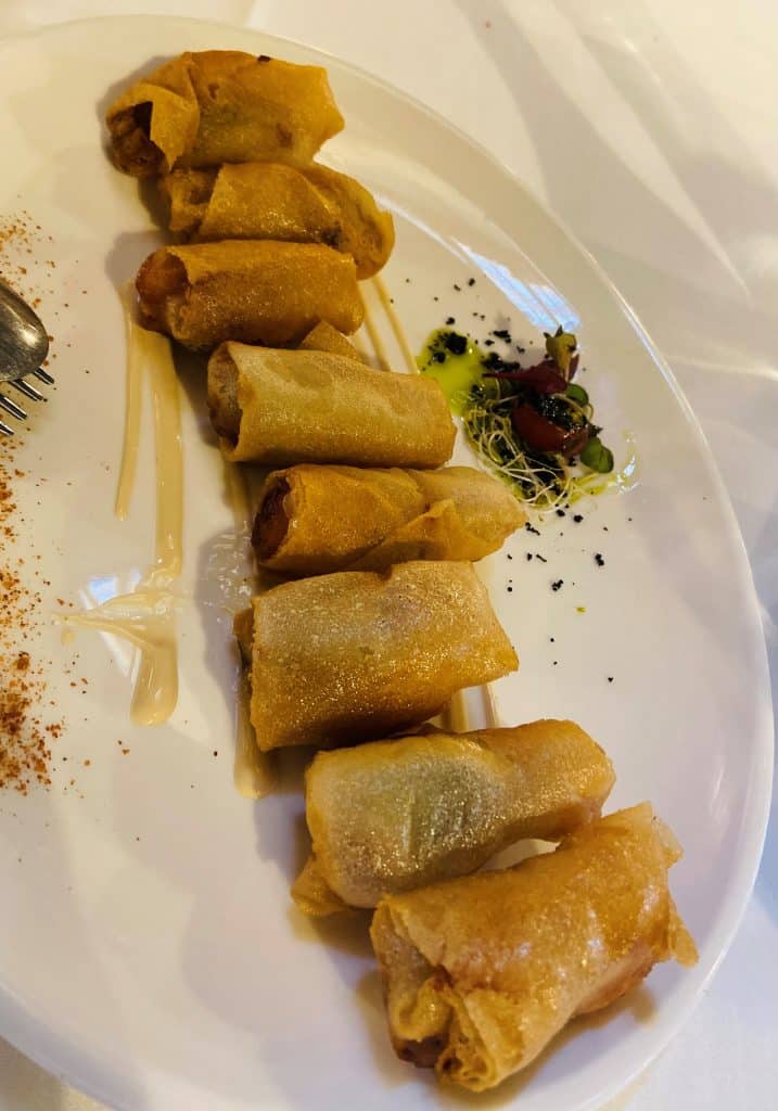 Crujiente de langostinos y salteado de verduras.