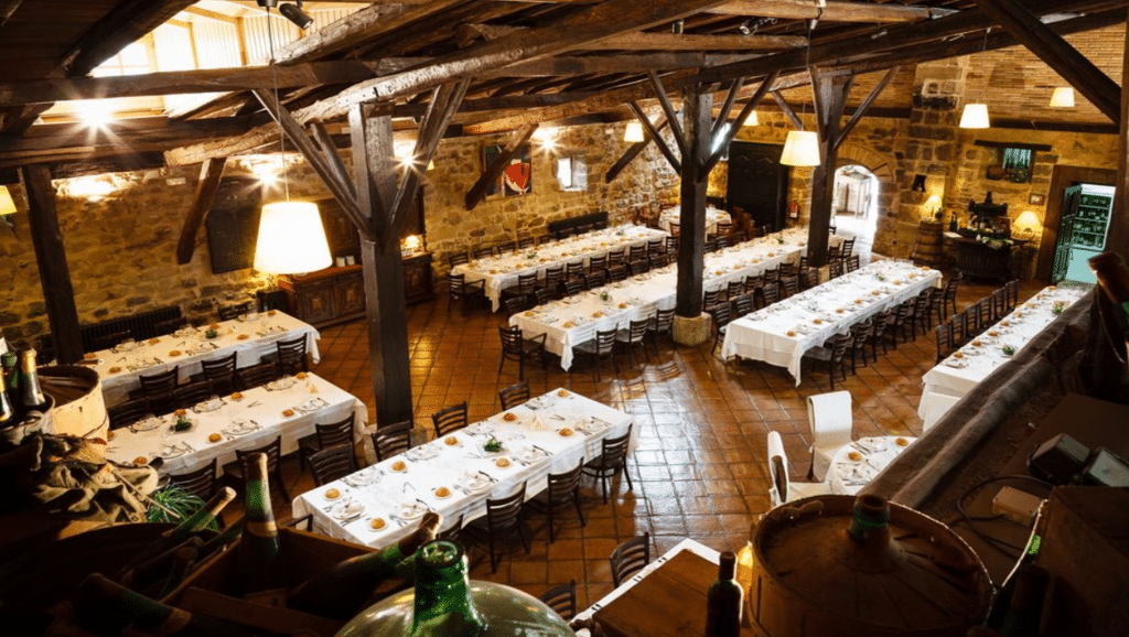 El restaurante La Vieja Bodega está ubicada en Casalarreina, un pueblito de La Rioja, a 6 km de Haro, la cuna del vino de Rioja, a 50 km de Logroño. El edificio que alberga el restaurante está hecho en piedra y ladrillo con techos altos, con vigas de madera y decorada con calidez y buen gusto. En los salones se unen la piedra y madera antiguas de vigas y alacenas con guiños de obras de arte moderno que han ido coleccionando. Tienen 2 amplios comedores, 2 salitas con chimenea y una terraza acristalada. Pero además cuentas con un amplio jardín y un calado doble para eventos.