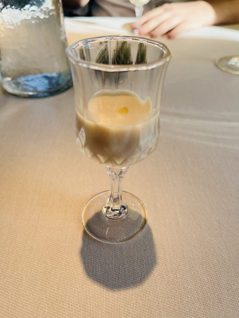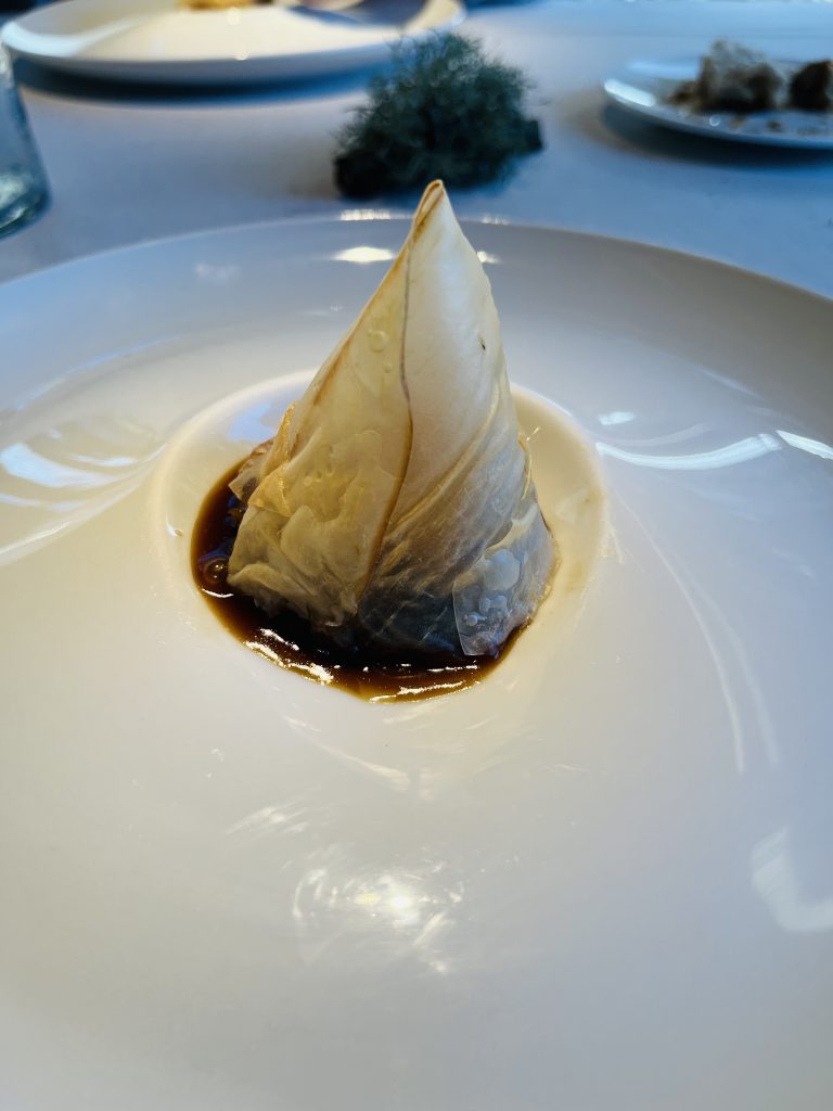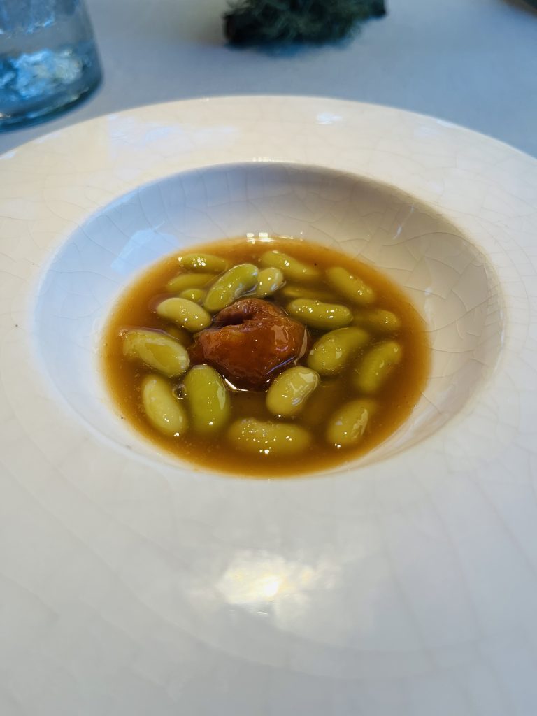 Caldo de pote, con berza crujiente, perlas de vinagre de sidra y morcilla ……….. extraordinario.