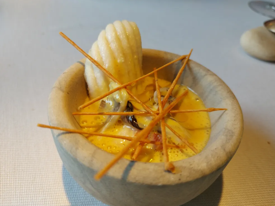 Cebolla rellena de bonito y yema líquida. Destapamos la caperuza en forma de cucurucho de yuca, crujiente, y nos encontramos un guiso de bonito con yema de huevo. Otro plato exquisito.