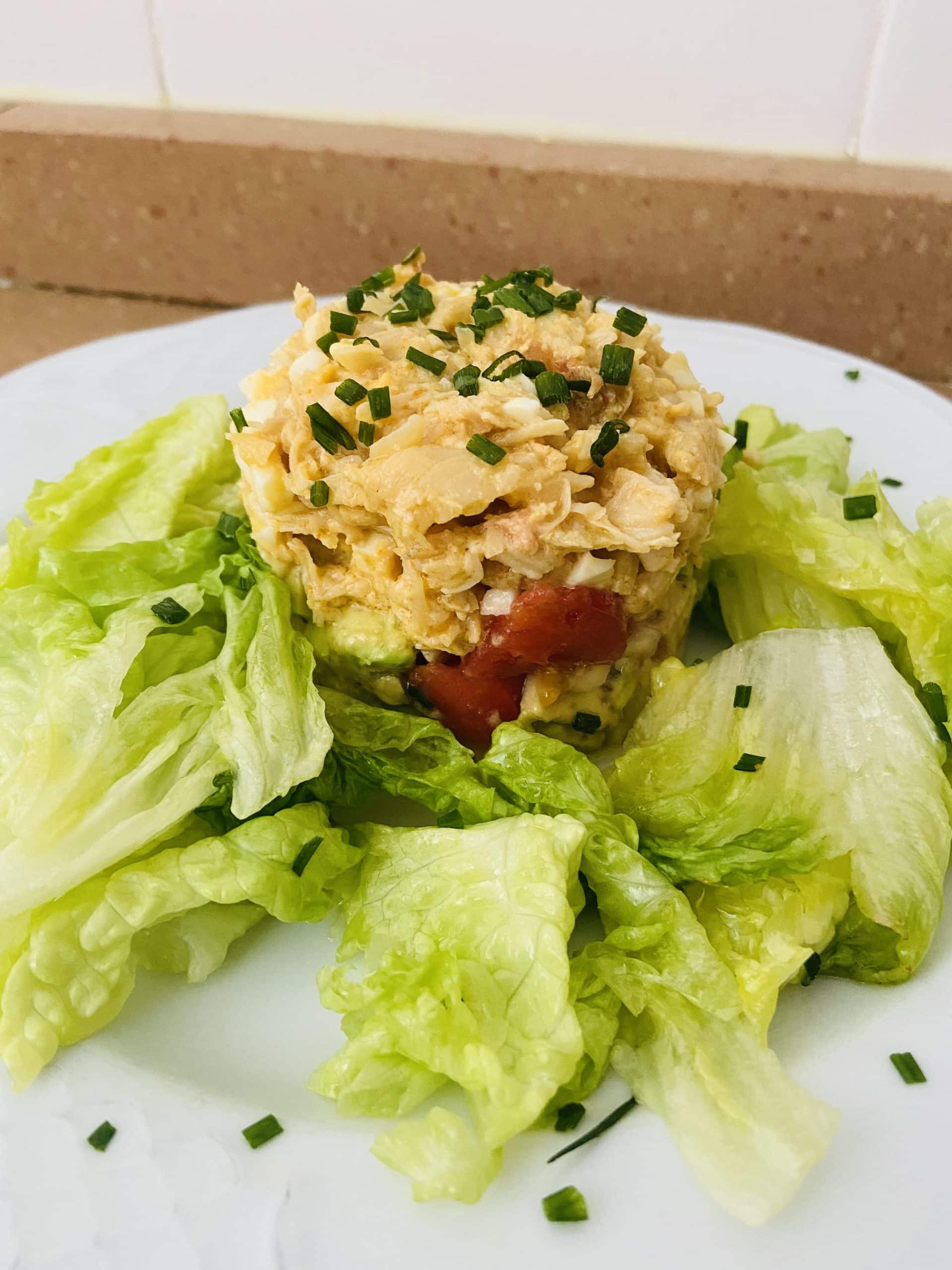 Con un molde ponemos de base el tomate con aguacate, sobre ello la mezcla de txangurro y huevos, y sobre ello cebollino picado. Lo rodeo todo con lechuga ya aliñada y retiro el molde.