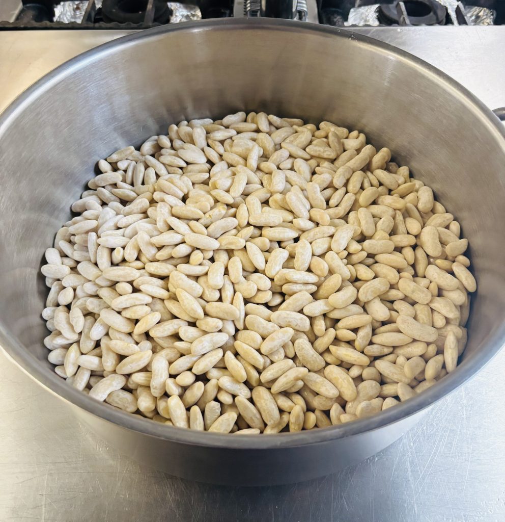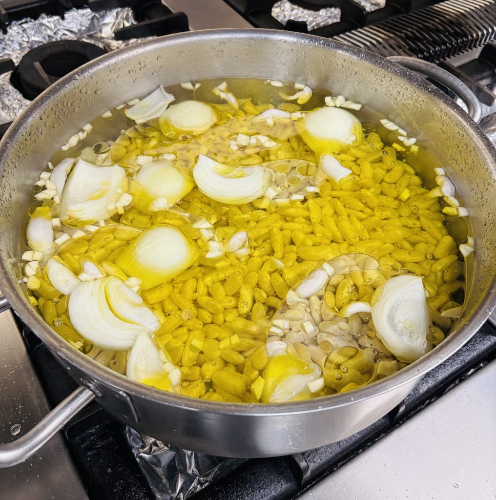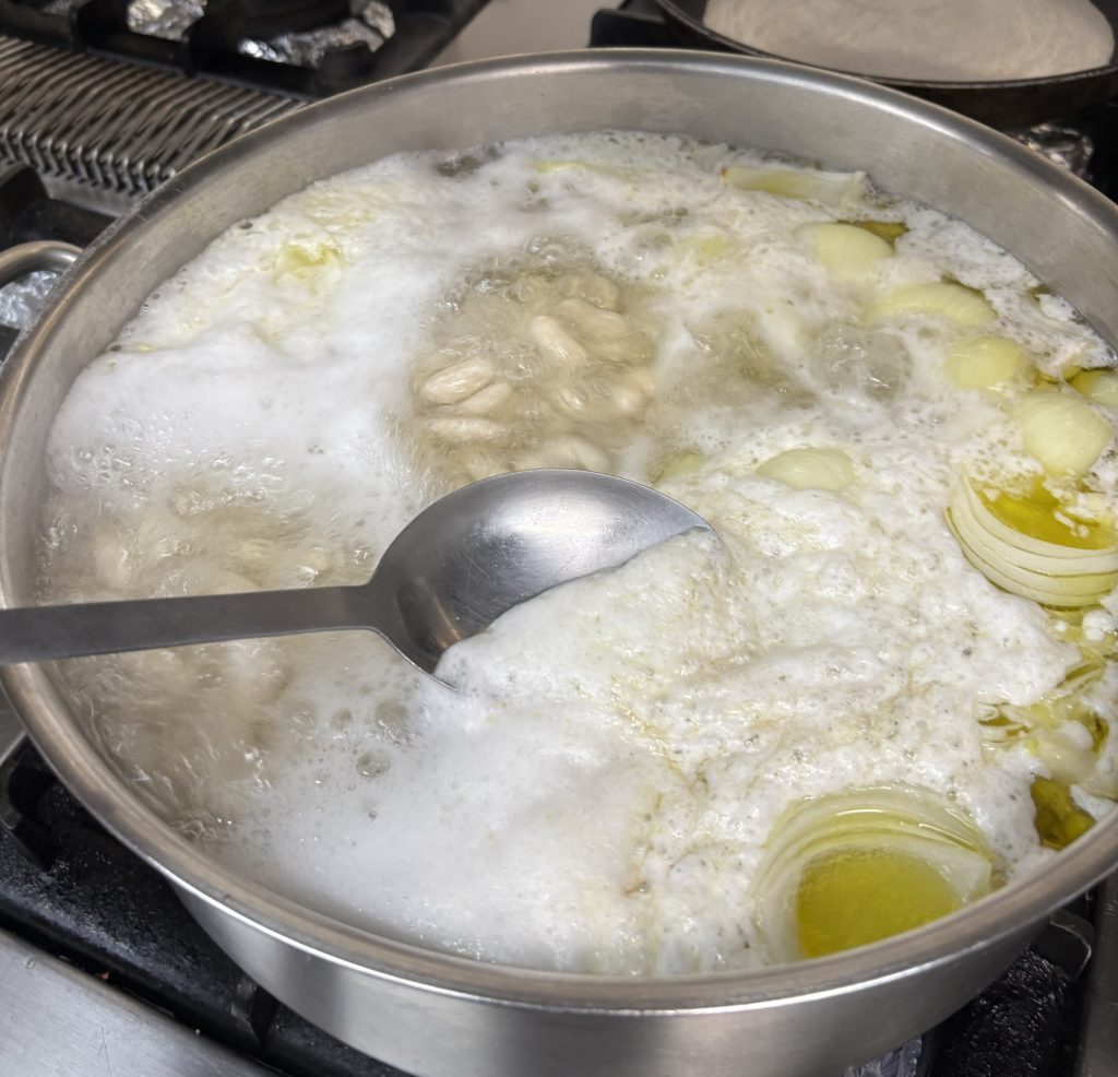 Igual que las fabes, el compango lo ponemos a remojo durante 8 horas, pero en este caso en agua templada, y descartamos el agua.