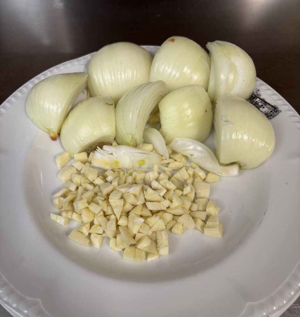 Pelamos y picamos las cebollas, cortandolas en 4 trozos. Y pelamos y picamos los dientes de ajo.