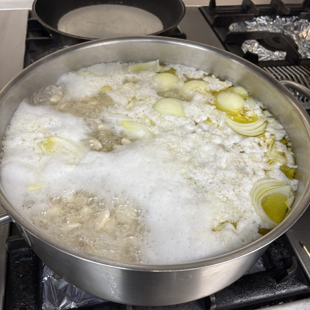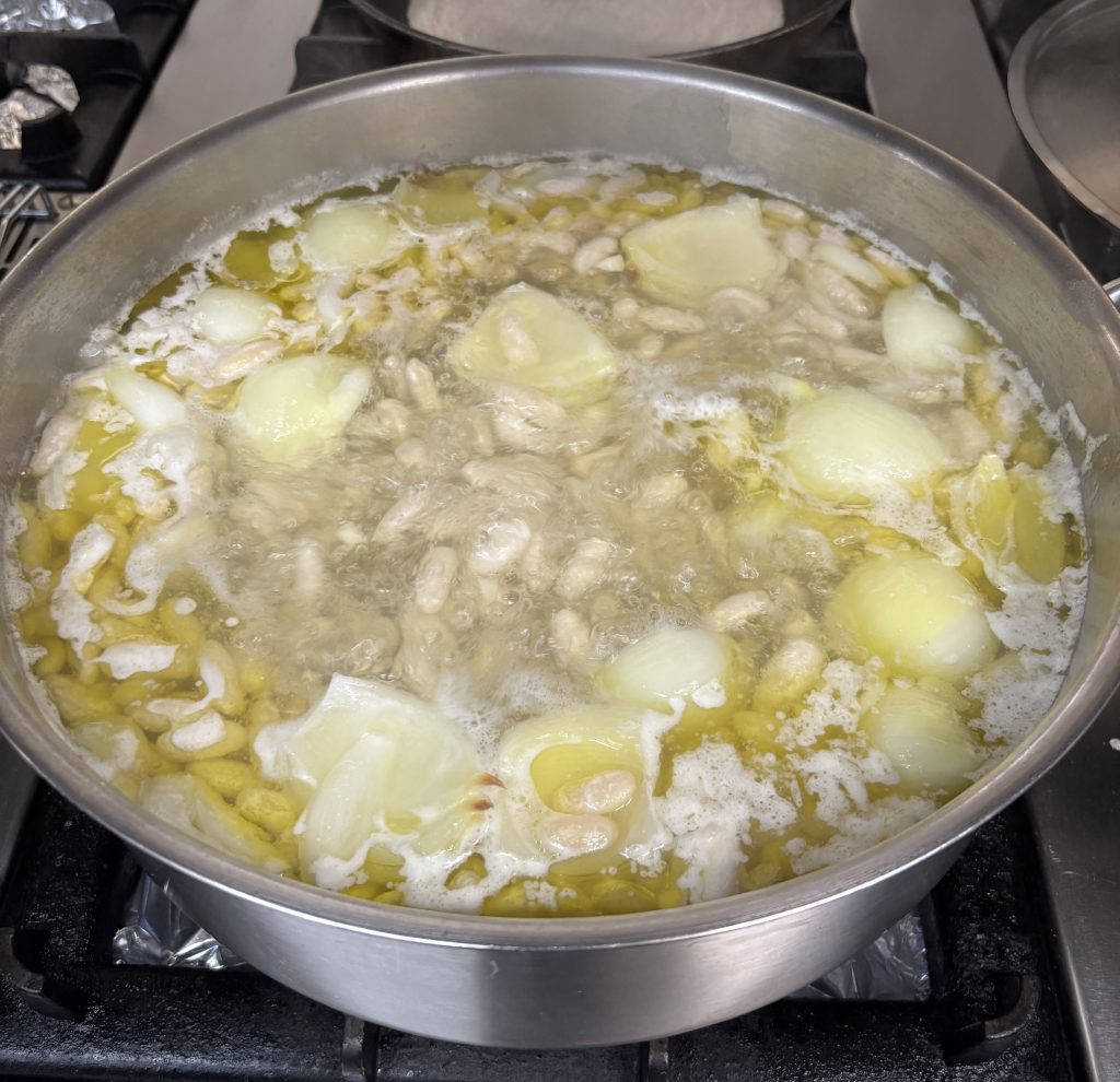 Añadimos el agua, cubriendolo todo hasta sobrepasar 2 dedos. Añadimos el aceite, a las fabes, cebolla y ajos, y lo ponemos al fuego, hasta que empiece a hervir.