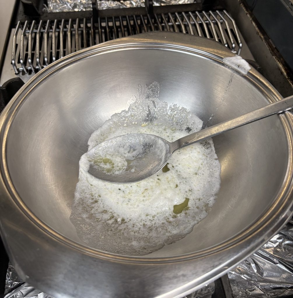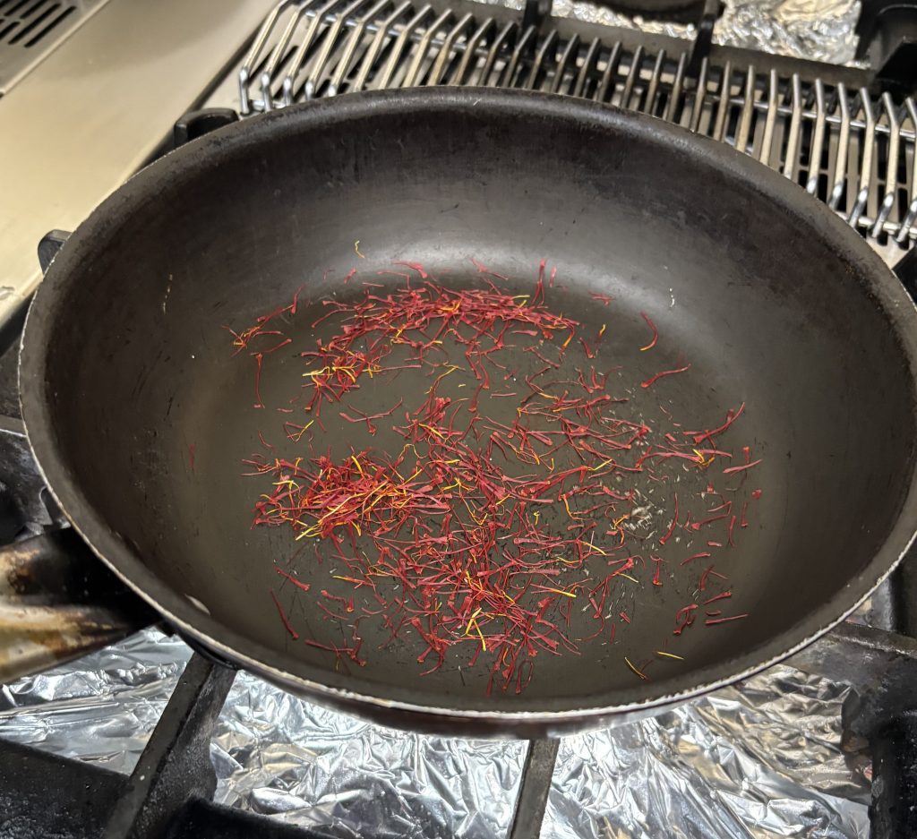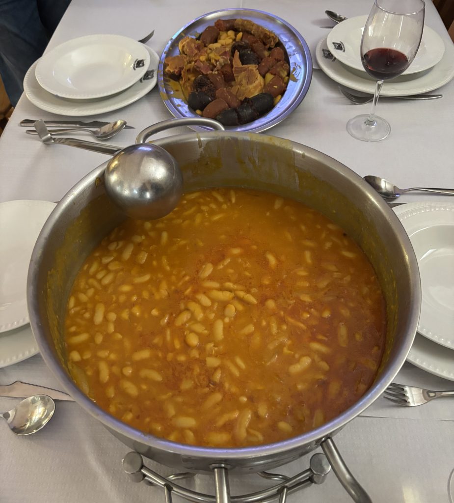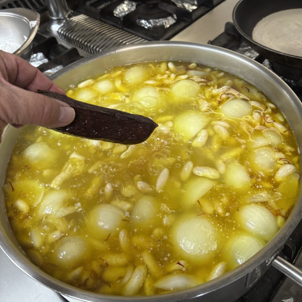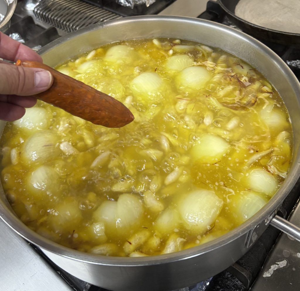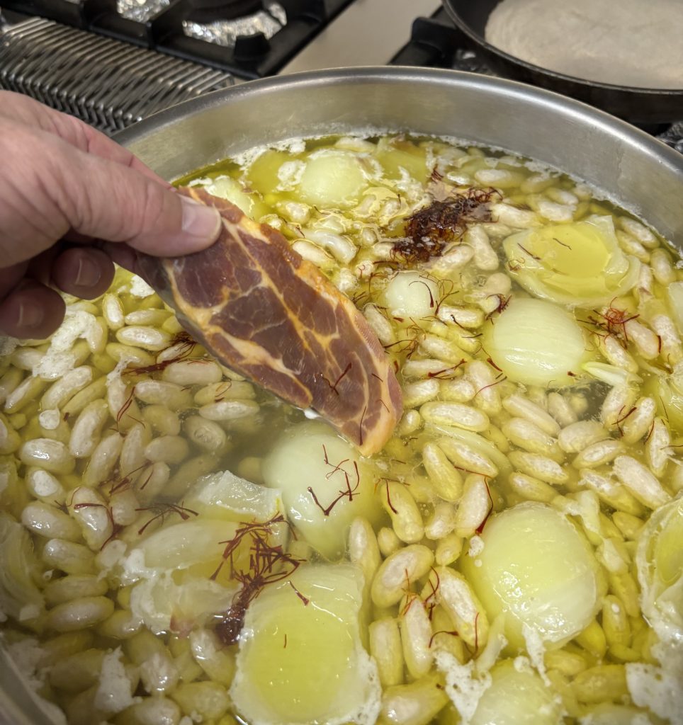 Añadimos el azafrán y el compango, asegurandonos que quede abajo de la cazuela, evitando así que se rompan las fabes.