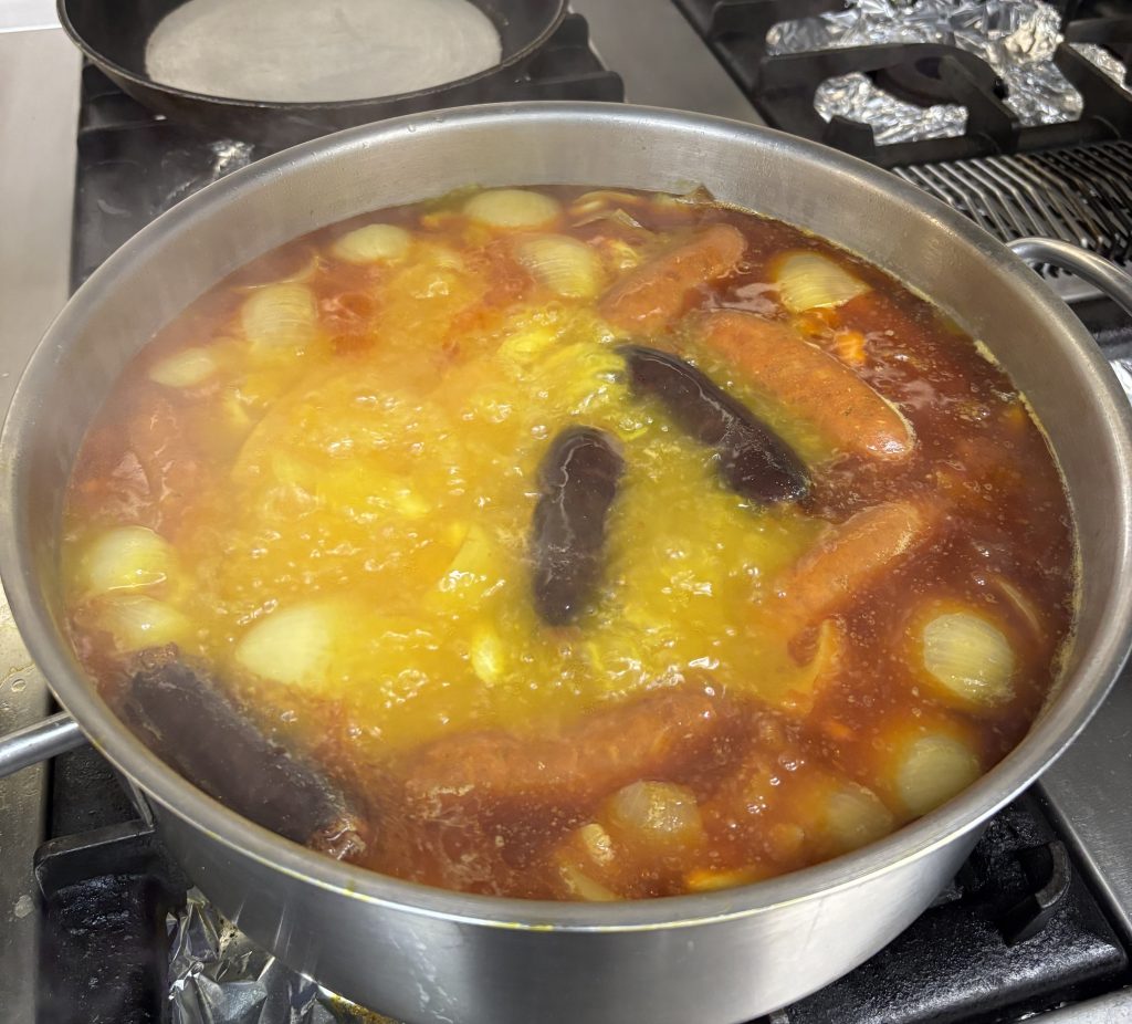 Añadimos la morcilla, dejandola en la parte superior, para que no se rompa.