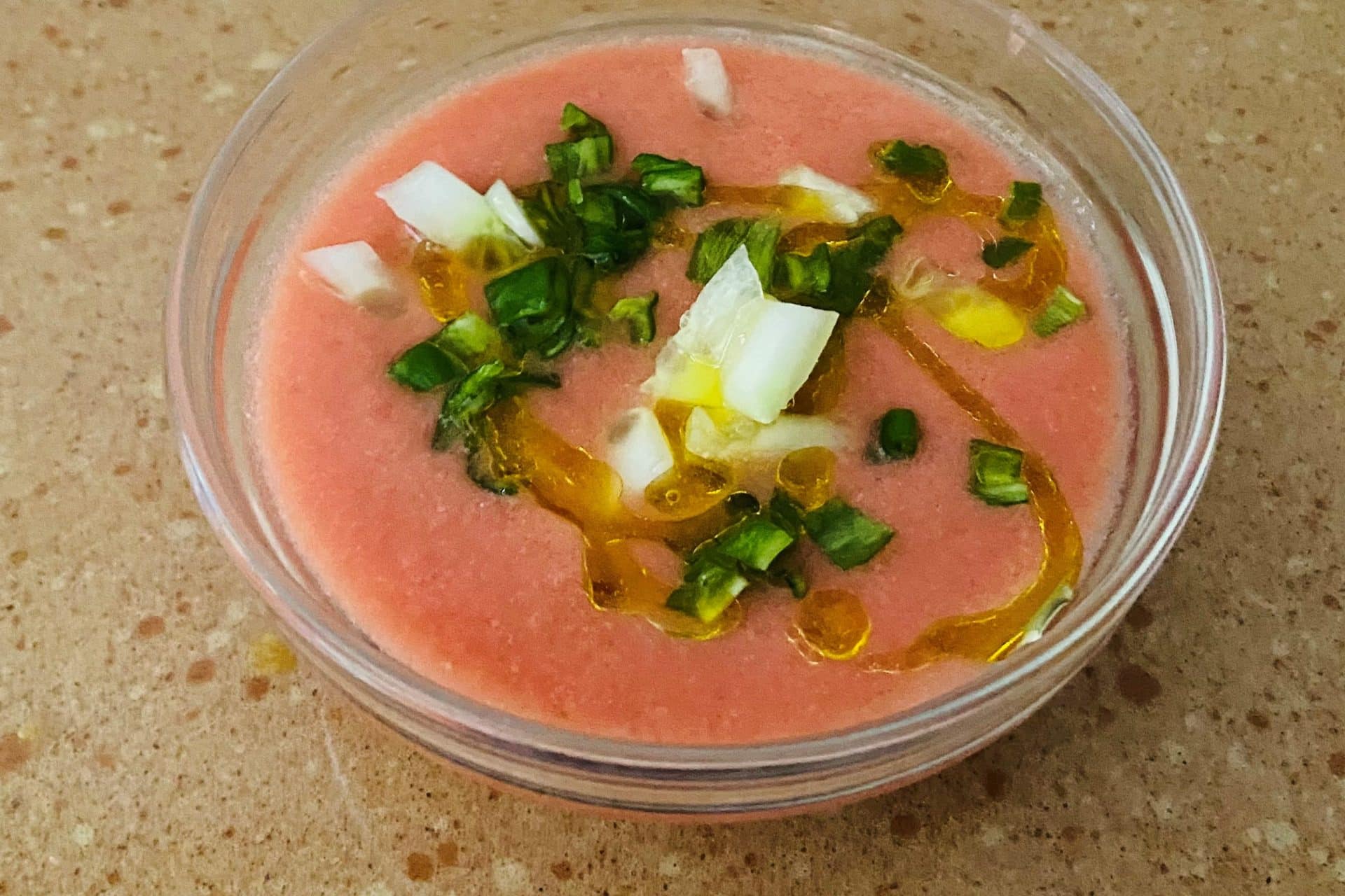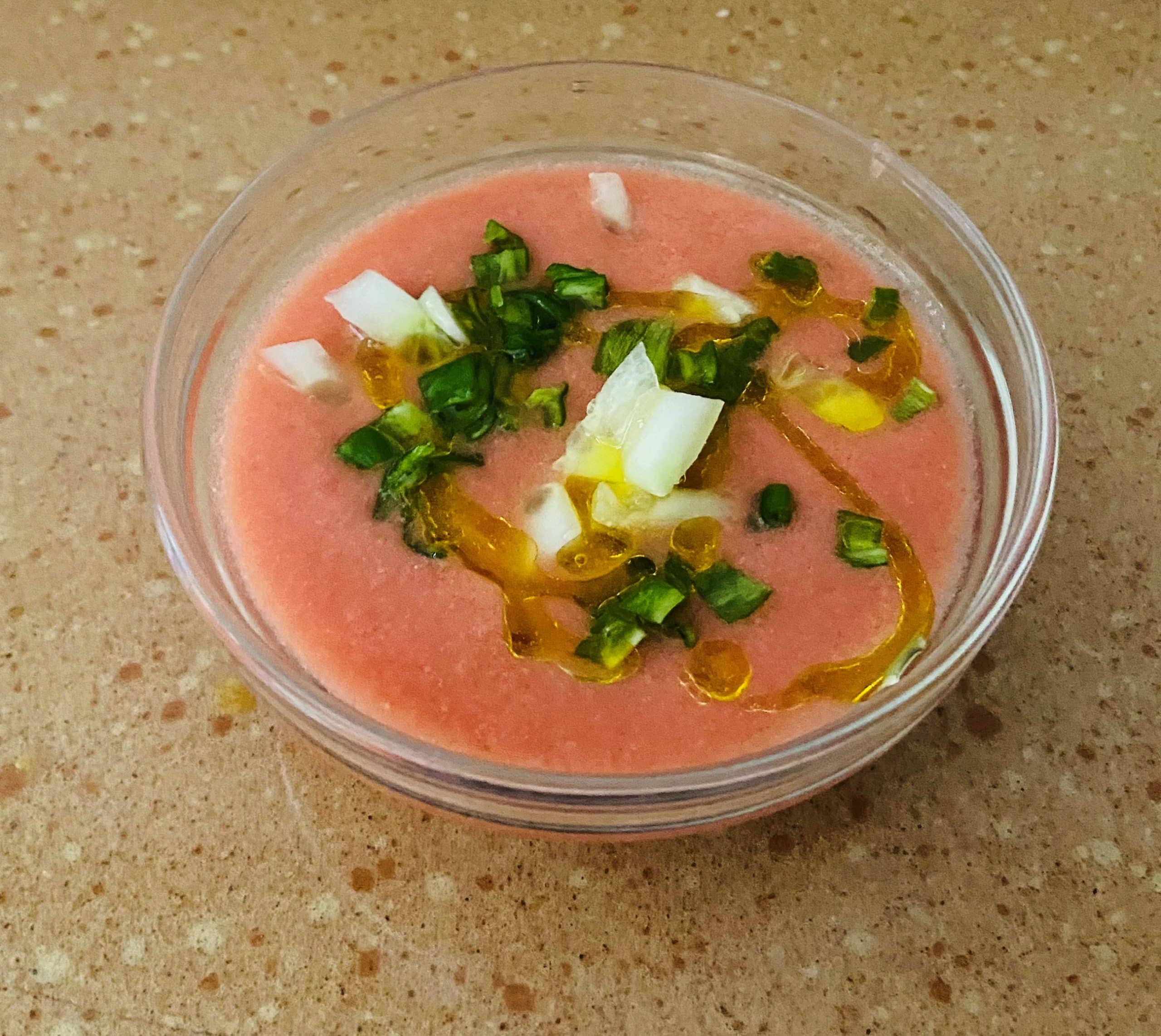 El gazpacho es una sopa fría con varios ingredientes como aceite de oliva, vinagre, agua, hortalizas crudas, generalmente tomates, pepinos, pimientos y ajo (opcional cebolla)