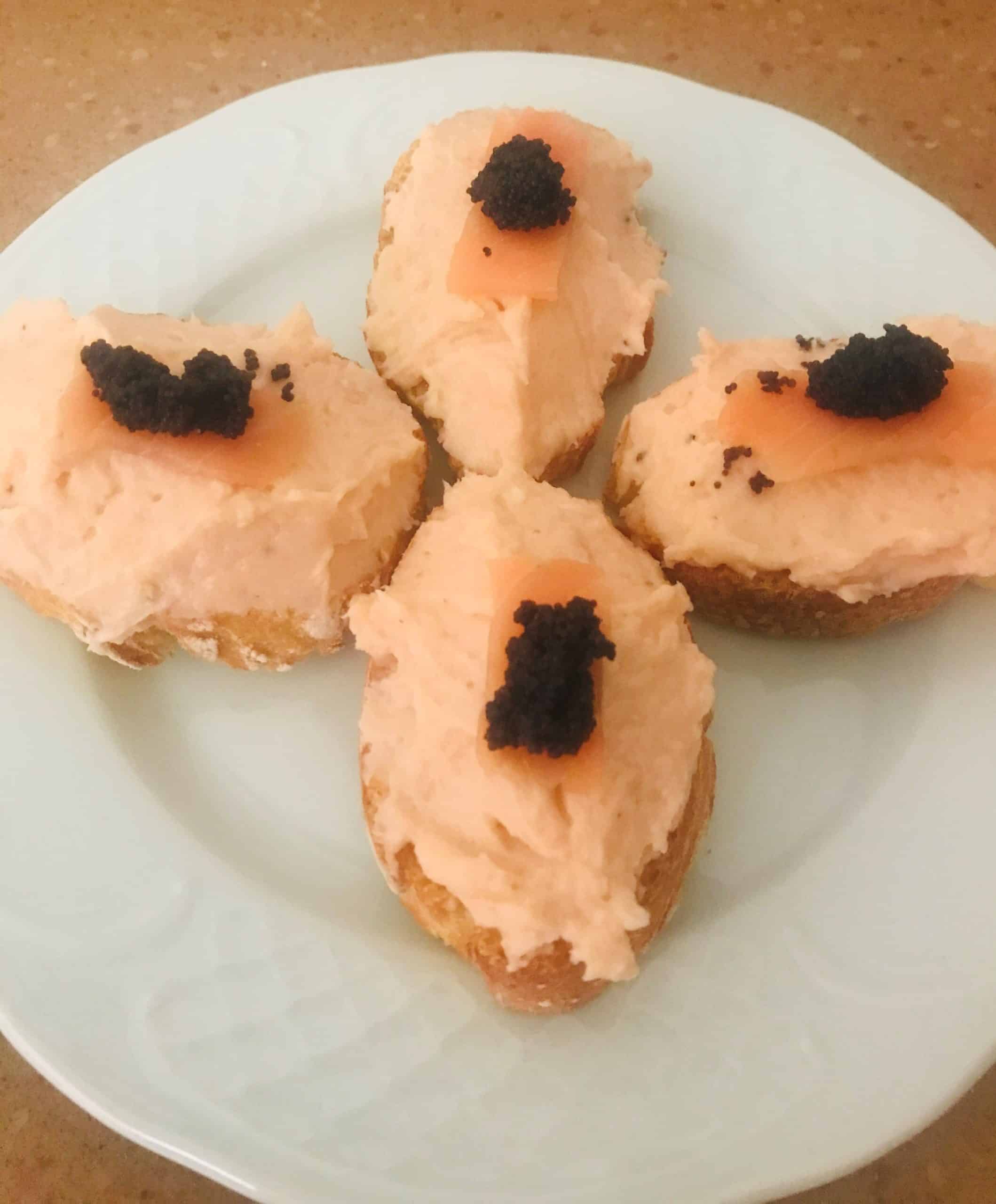 Para servir, extiendo la pasta de salmón sobre la rebanada de pan tostado y adorno con una lonchita de salmón y una huevas.