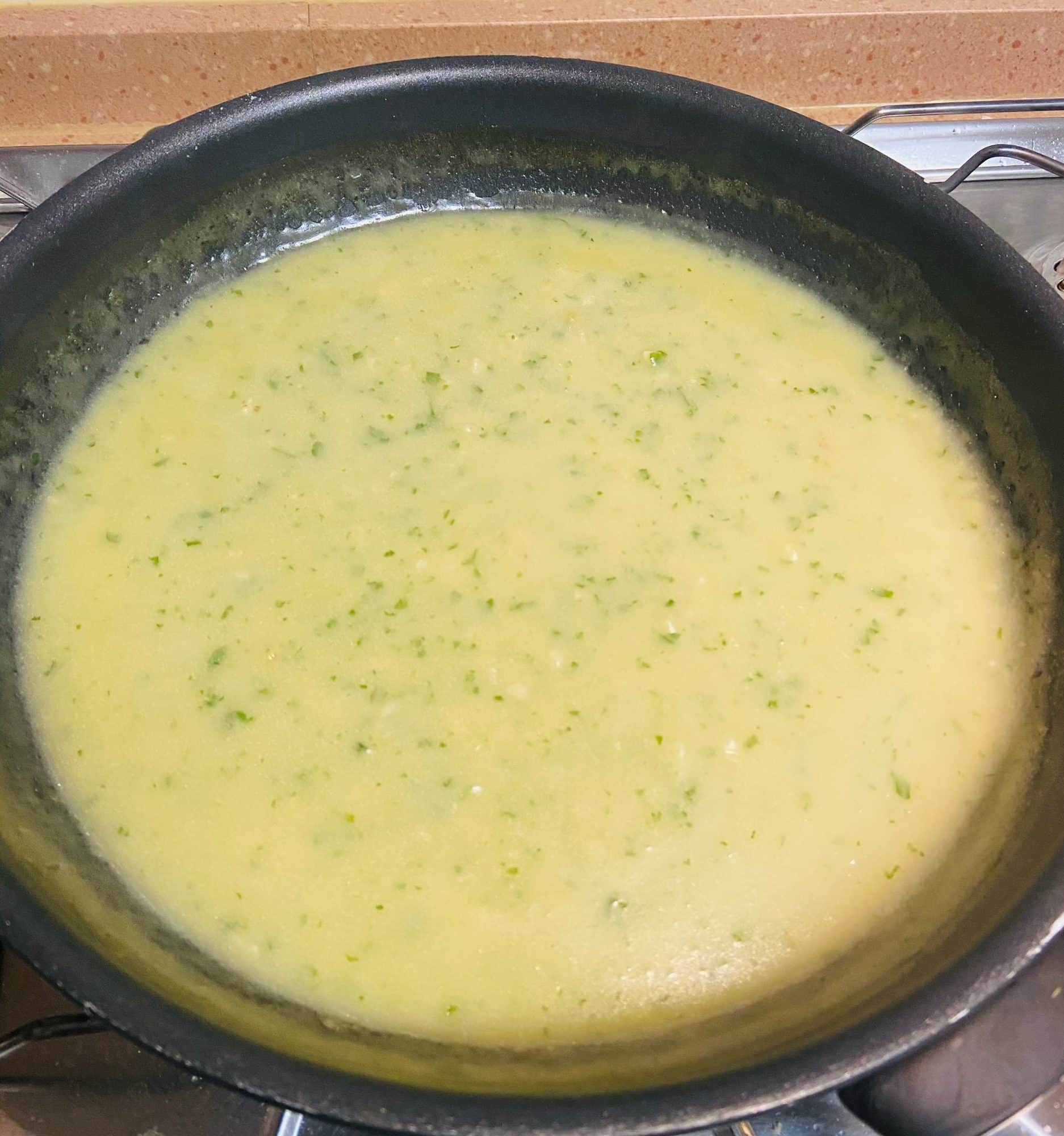 Sobre la harina y sin dejar de remover añadimos poco a poco el caldo de pescado, el vino blanco o Txakoli y opcionalmente el agua de espárragos (yo siempre la añado). Cuando tengamos la textura deseada, añadimos el perejil picado, y damos el punto de sal.