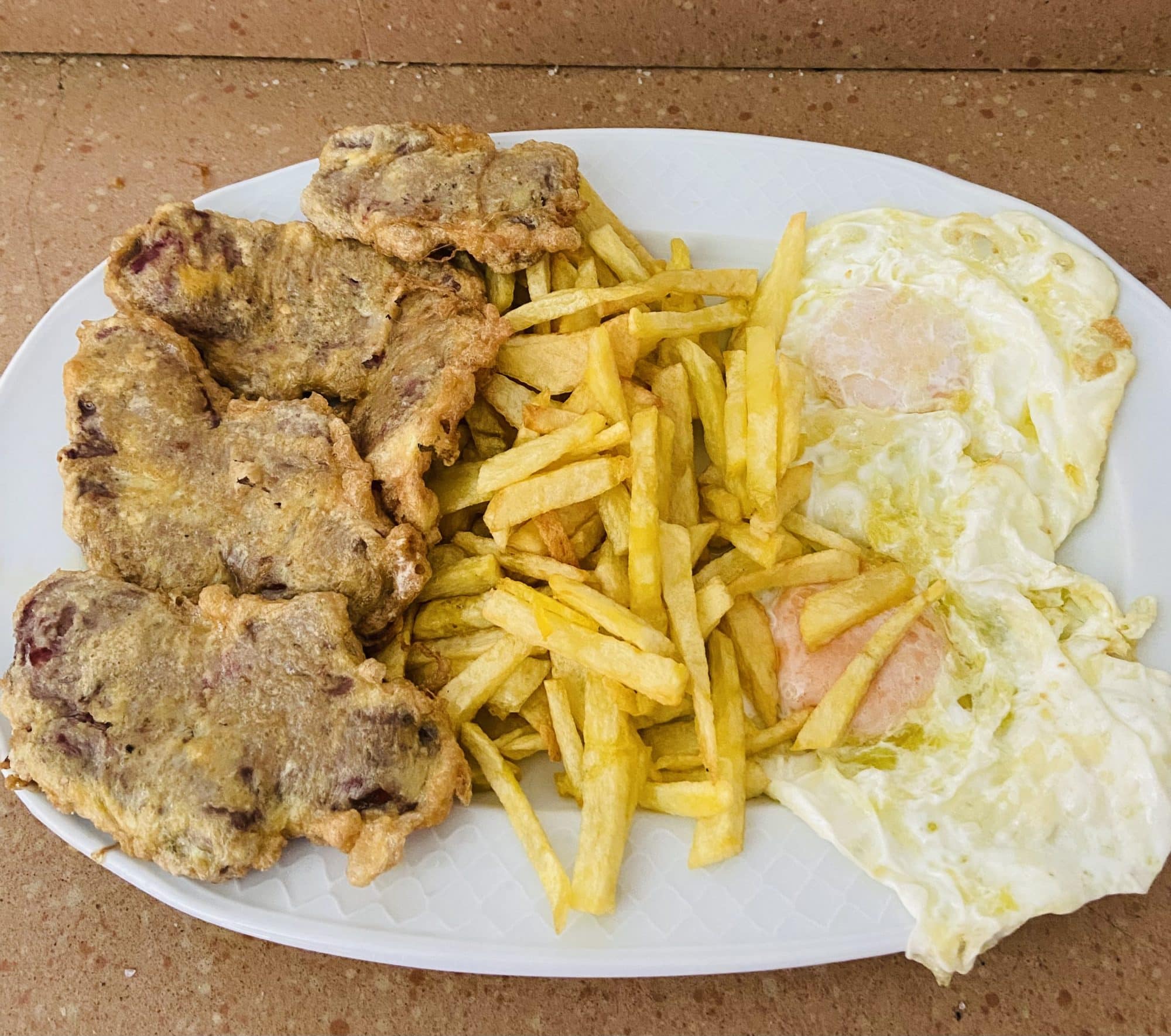 Servimos en el plato los centros de solomillo, con las patatas y los huevos fritos.