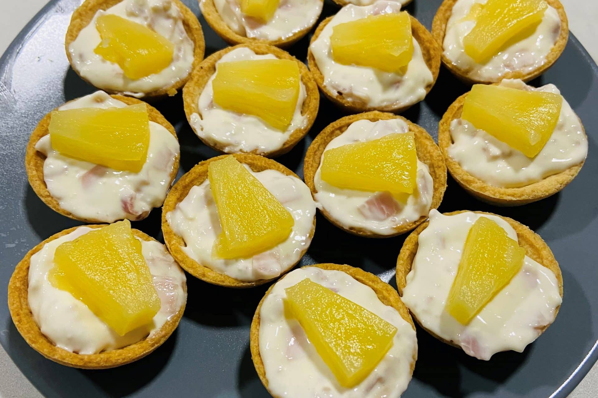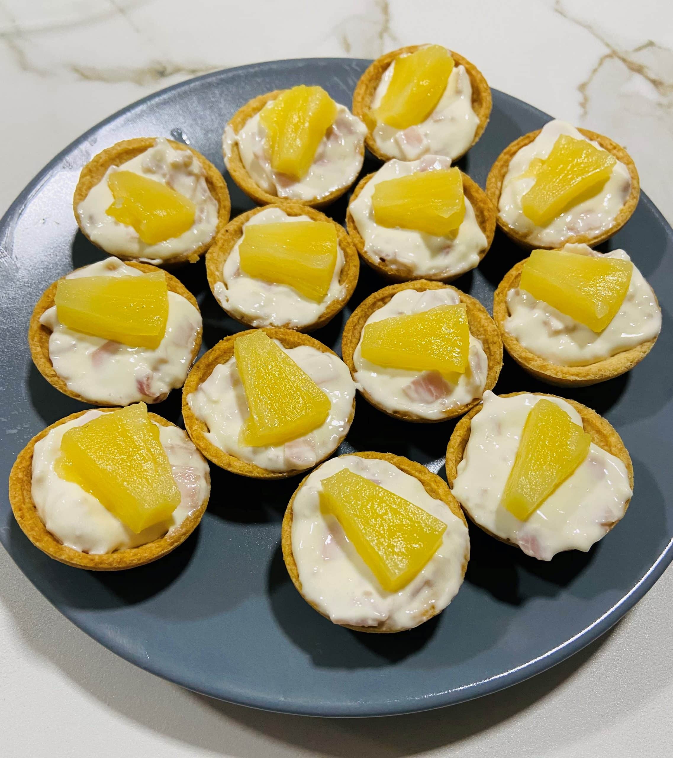 Añadimos sobre las tartaletas una pequeña porción de piña en su jugo, y ya lo tenemos.