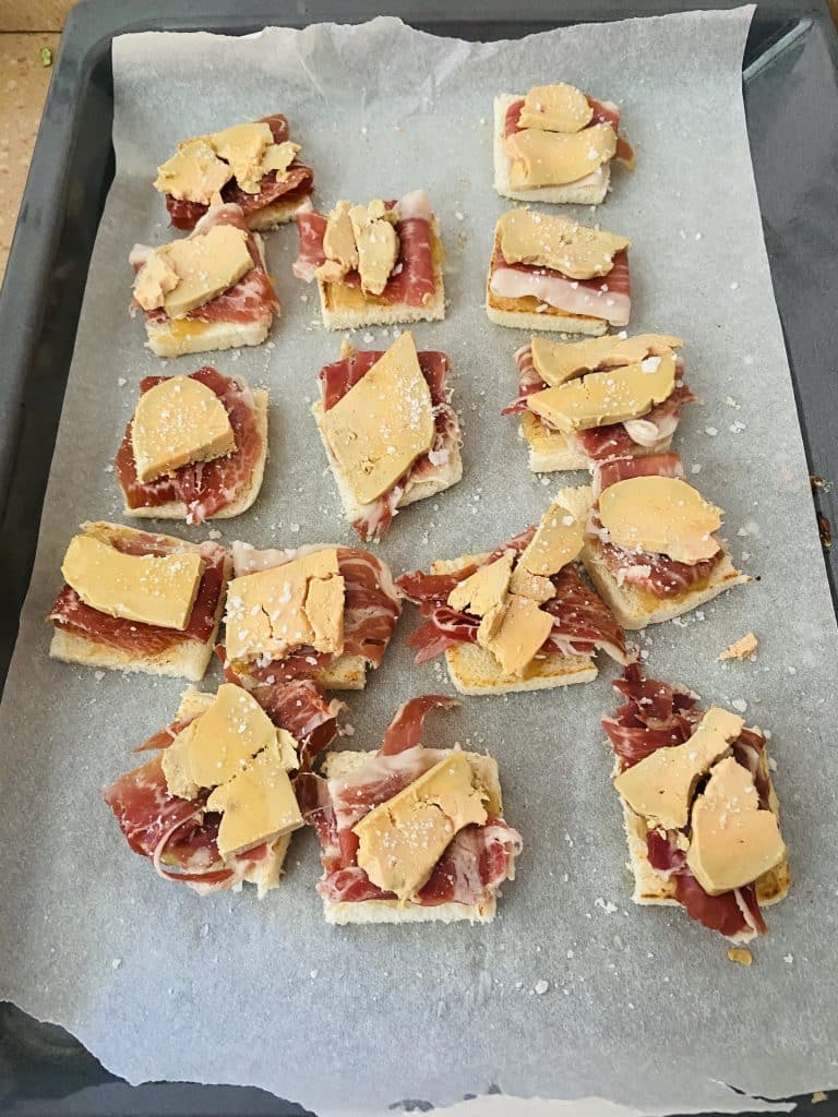 Pre calentamos el horno a 200 grados, introducimos los pintxos o canapés durante unos 5 minutos aproximadamente. El punto está en cuanto se funde un poco el foie.