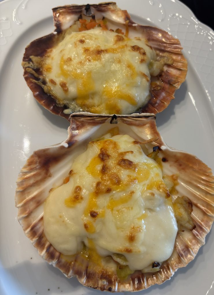Cojo la concha de la vieira, la rellenamos con la mezcla de verdura y vieira reducida y lo cubrimos con la bechamel, para seguido sobre ello rayar el parmesano.