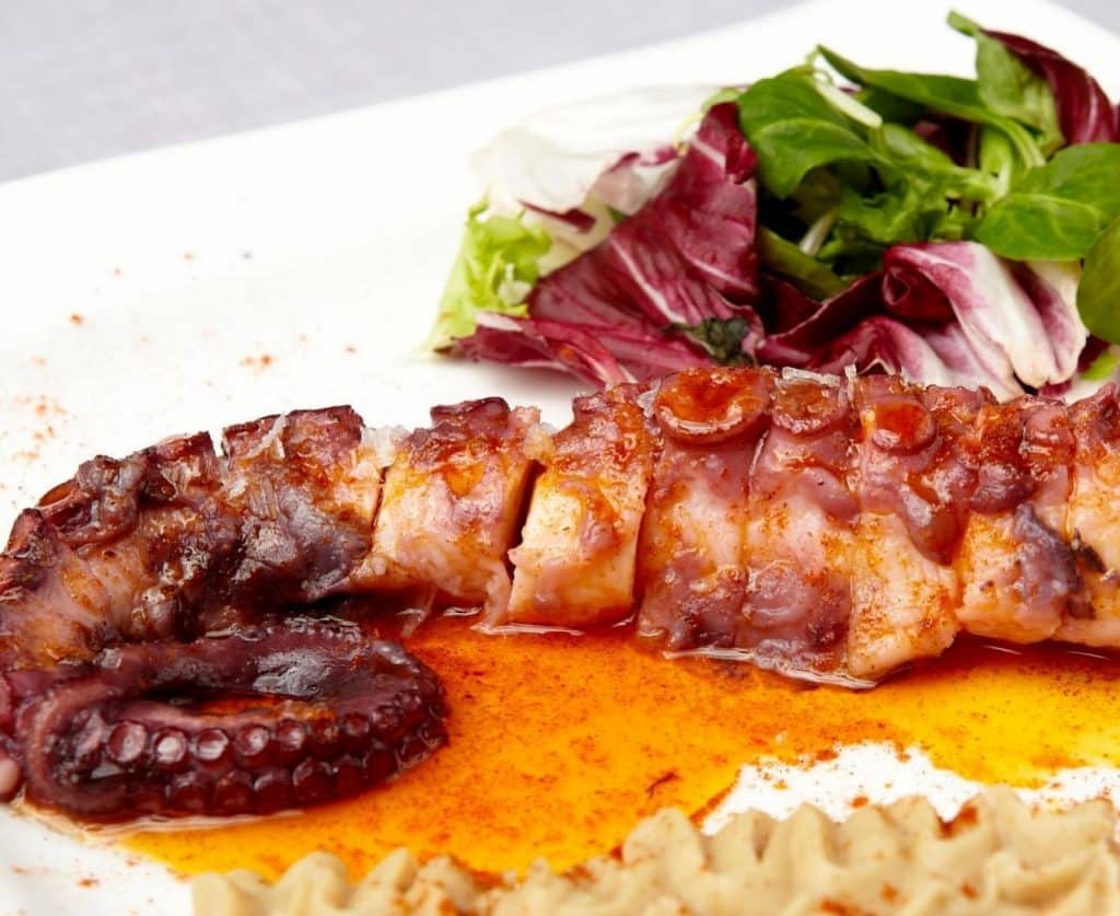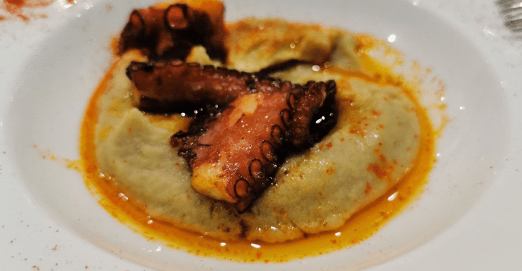 El pulpo a la brasa sobre una crema de patata con pimentón tenéis que probarlo.