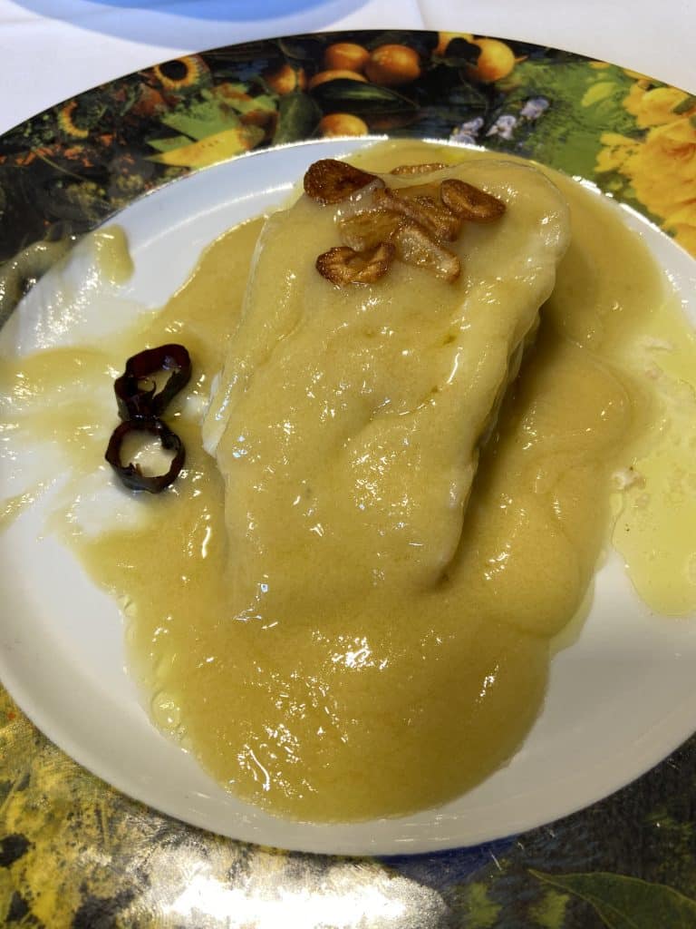 Una rica merluza rellena de txangurro y salsa mariscada.