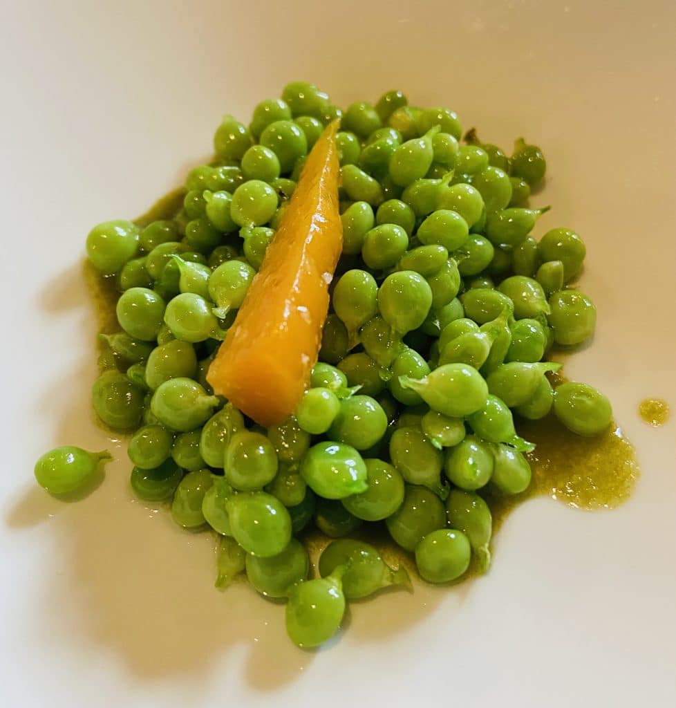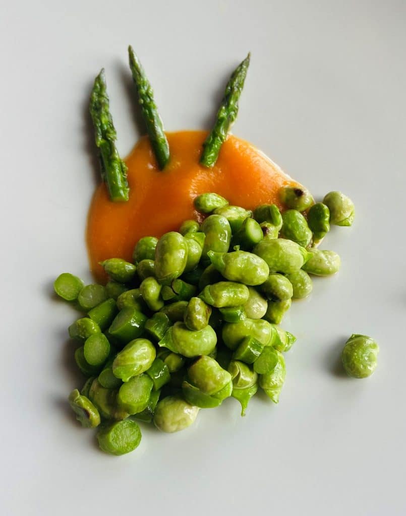 Unas habas tiernas con una crema de calabaza y espárragos.