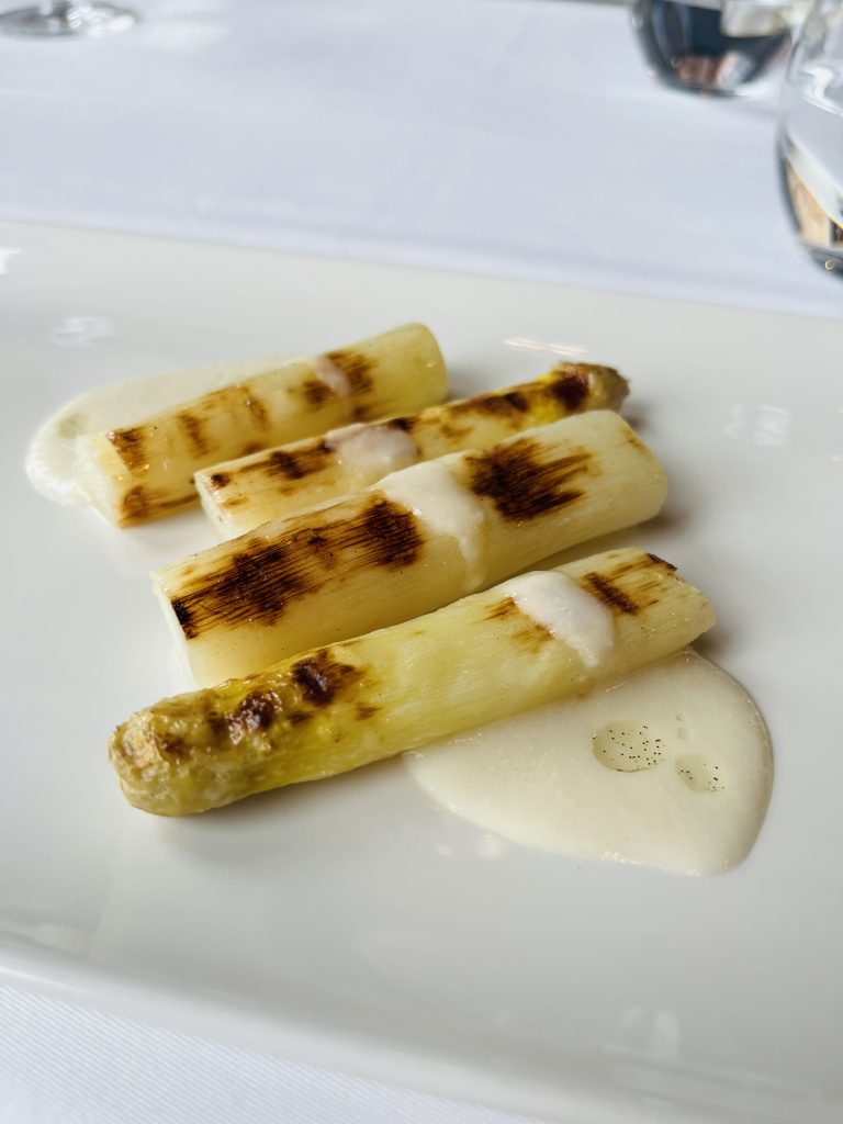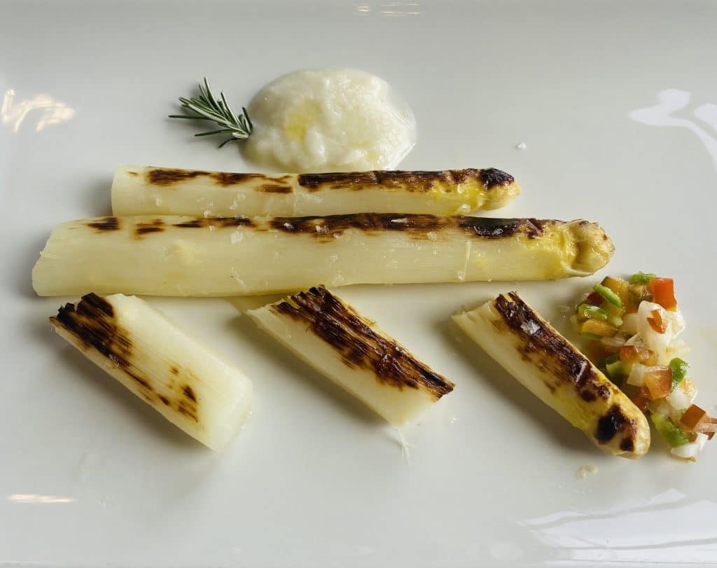 Espárragos tiernos a la brasa, con crema de espárrago y vinagreta.