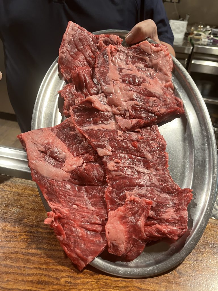Recientemente, nos ofreció una carne de matrícula de honor. Entraña ò Arrachera mexicana, este sería el nombre de ese corte, y la raza de el animal Wagyu Australiano. Y a continuación comimos, lo que para mi ha sido la carne más rica que he podido comer en mi vida, lomo bajo de raza Kagoshima calificado A5 + , Wagyu japonés original.