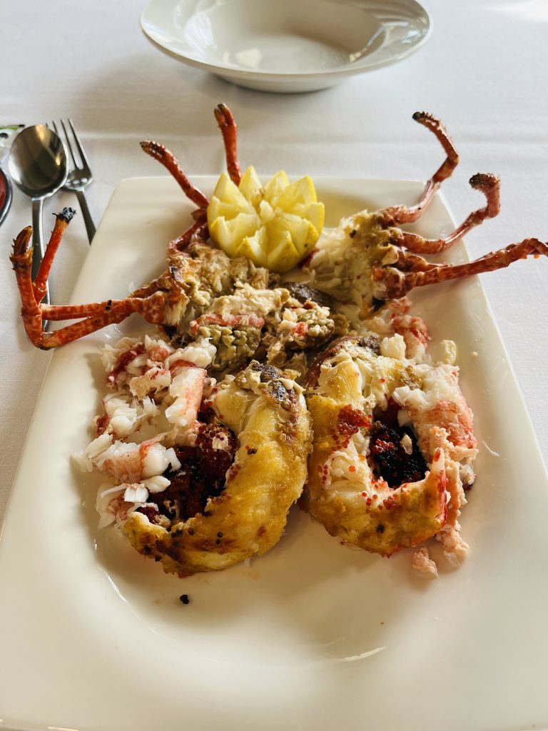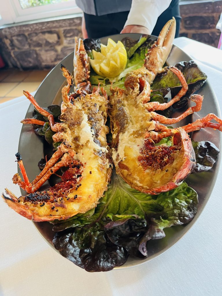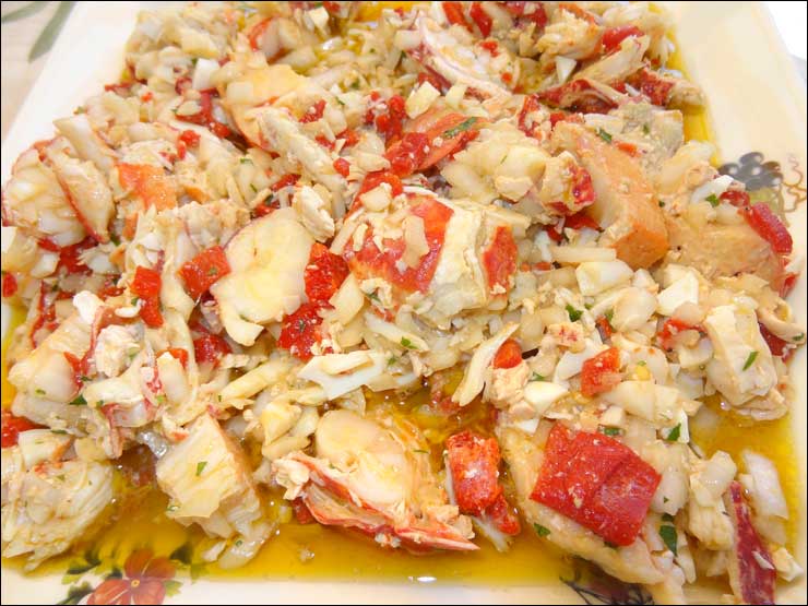 Salpicón de bogavante, donde es todo bogavante y diferentes mariscadas, donde la plancha se ve estupendamente.