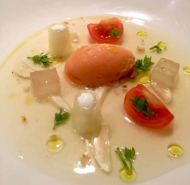 Sopa fría de melón y cardamomo verde, tomate helado y emulsión de ibéricos, o Alcachofa, hongos, cigala y pil pil de foie, están buenísimos.