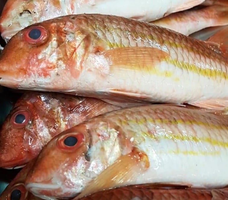 Salmonete con panceta rellena de Zubiri y el Rodaballo a la brasa, tapioca de algas crujiente y pil pil de cebollino y piparras.