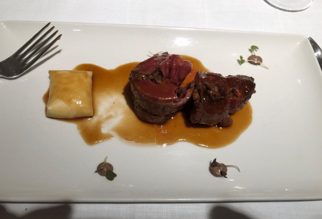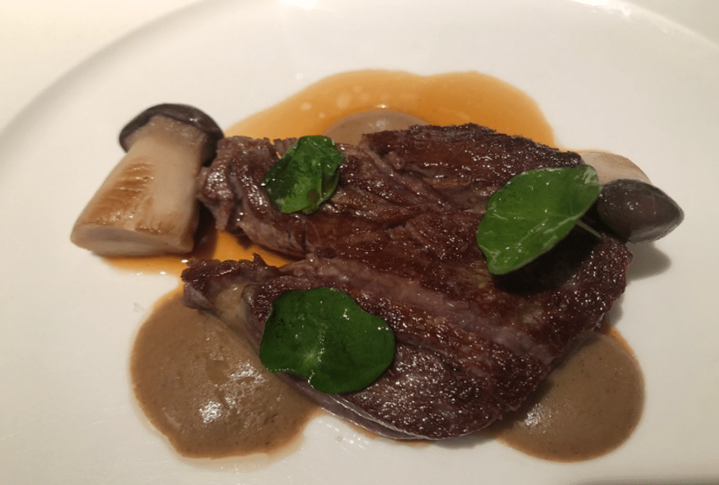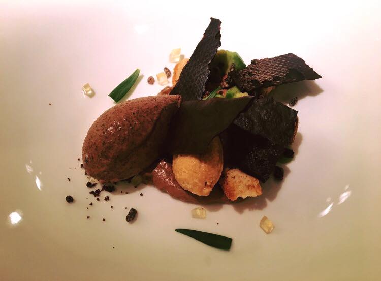 Molleja de ternera, alcaparras y encurtidos, y Perdiz roja en escabeche de cacao y ralladura de macadamia, Delicioso guiso e impecable cocción rosada de la pechuga. Escabeche muy suave.