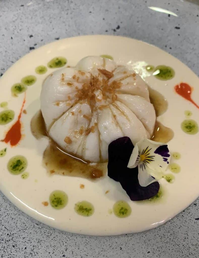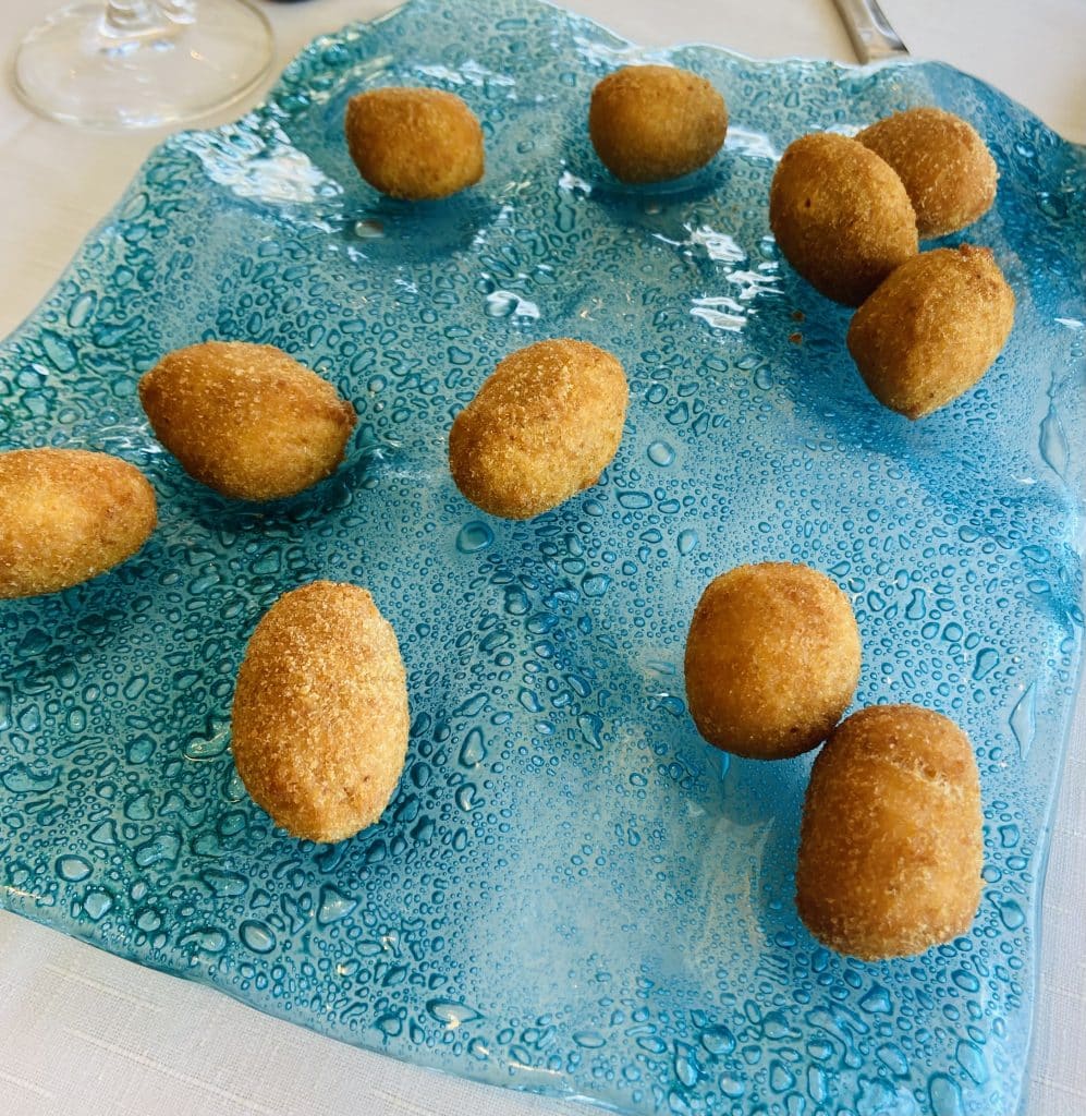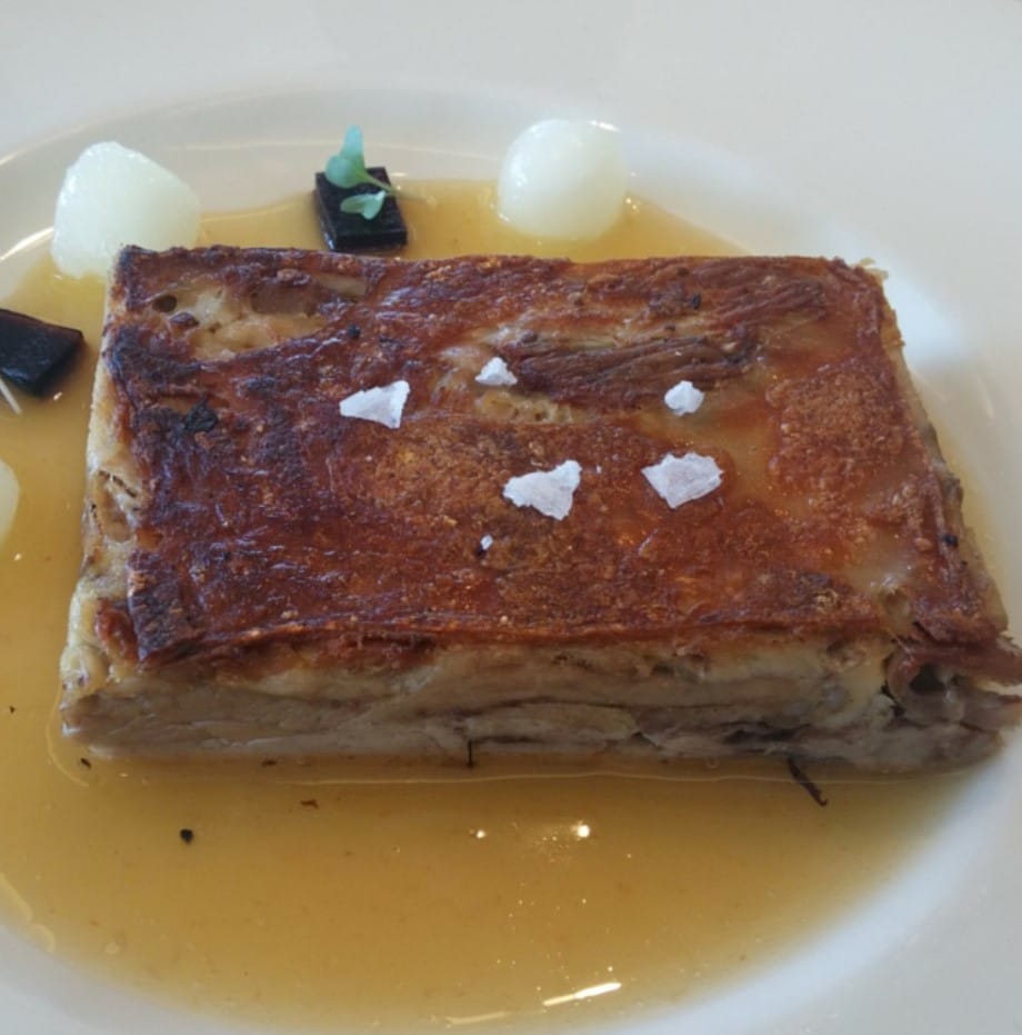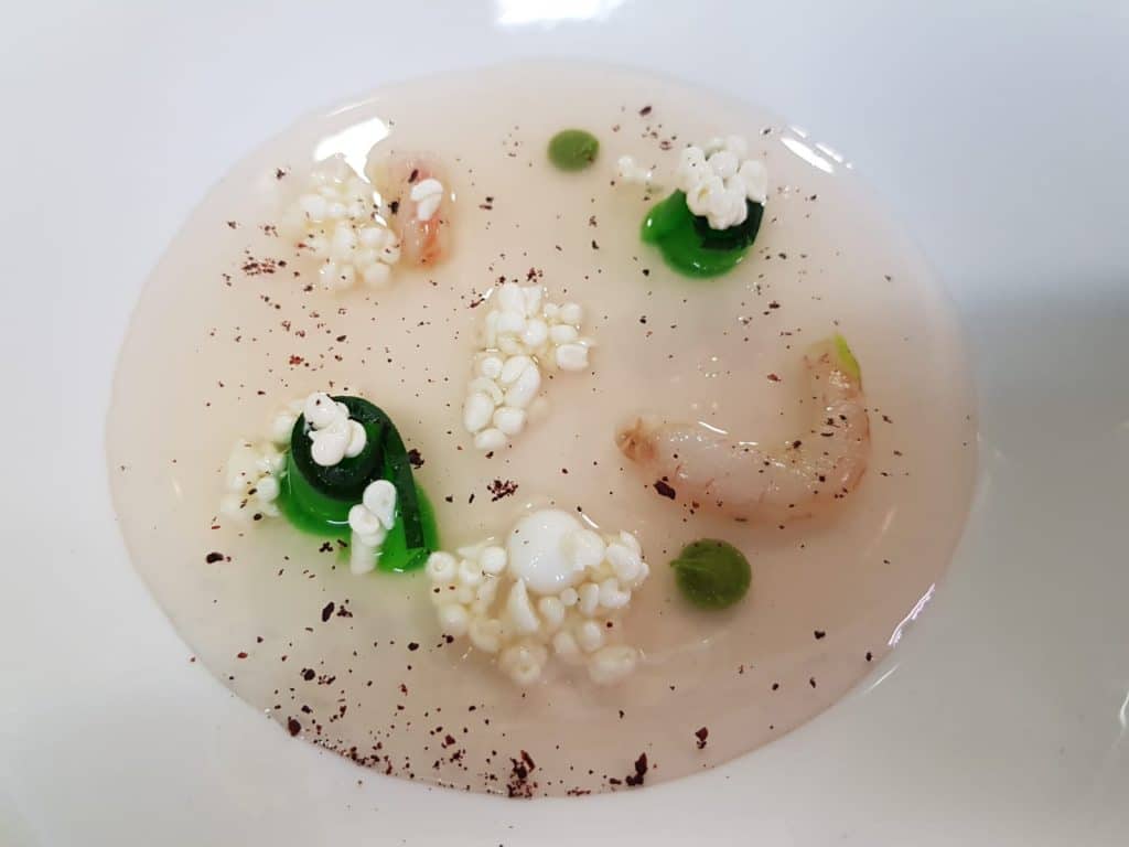 Puedes empezar con unos ricos entrantes, que van cambiando a lo largo del año. En este caso, una sopita de talo, con esferificación de gilda y croqueta de txistorra.