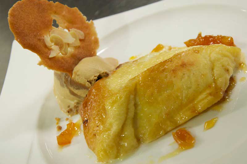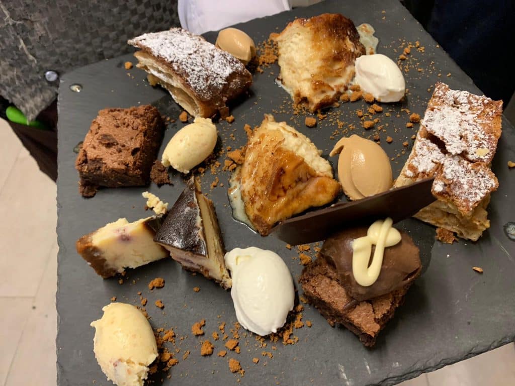 En postres, además de una gran variedad de quesos, tenemos una clásica tostada caramelizada con confitura de naranja y helado de caramelo, o un pastel de chocolates con helado de yogur y también hojaldres, entre otras propuestas.