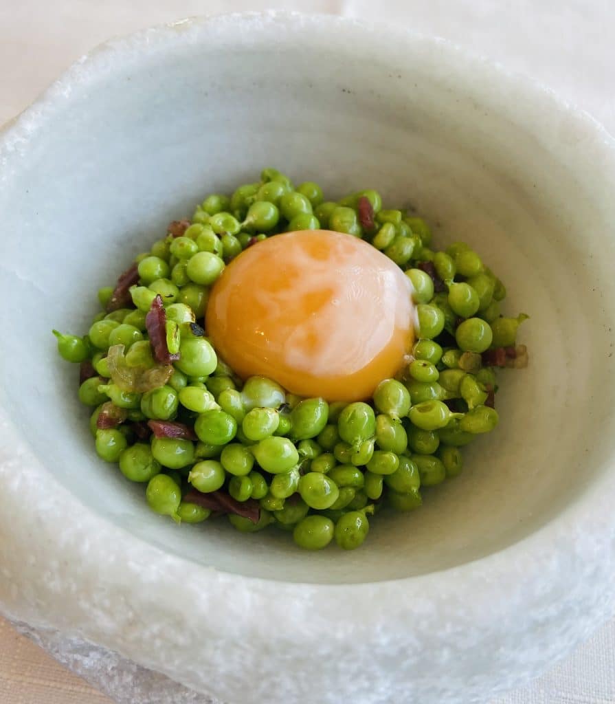 Unas ricas croquetas de txistorra, o unos ricos guisantes lágrima con yema de huevo.